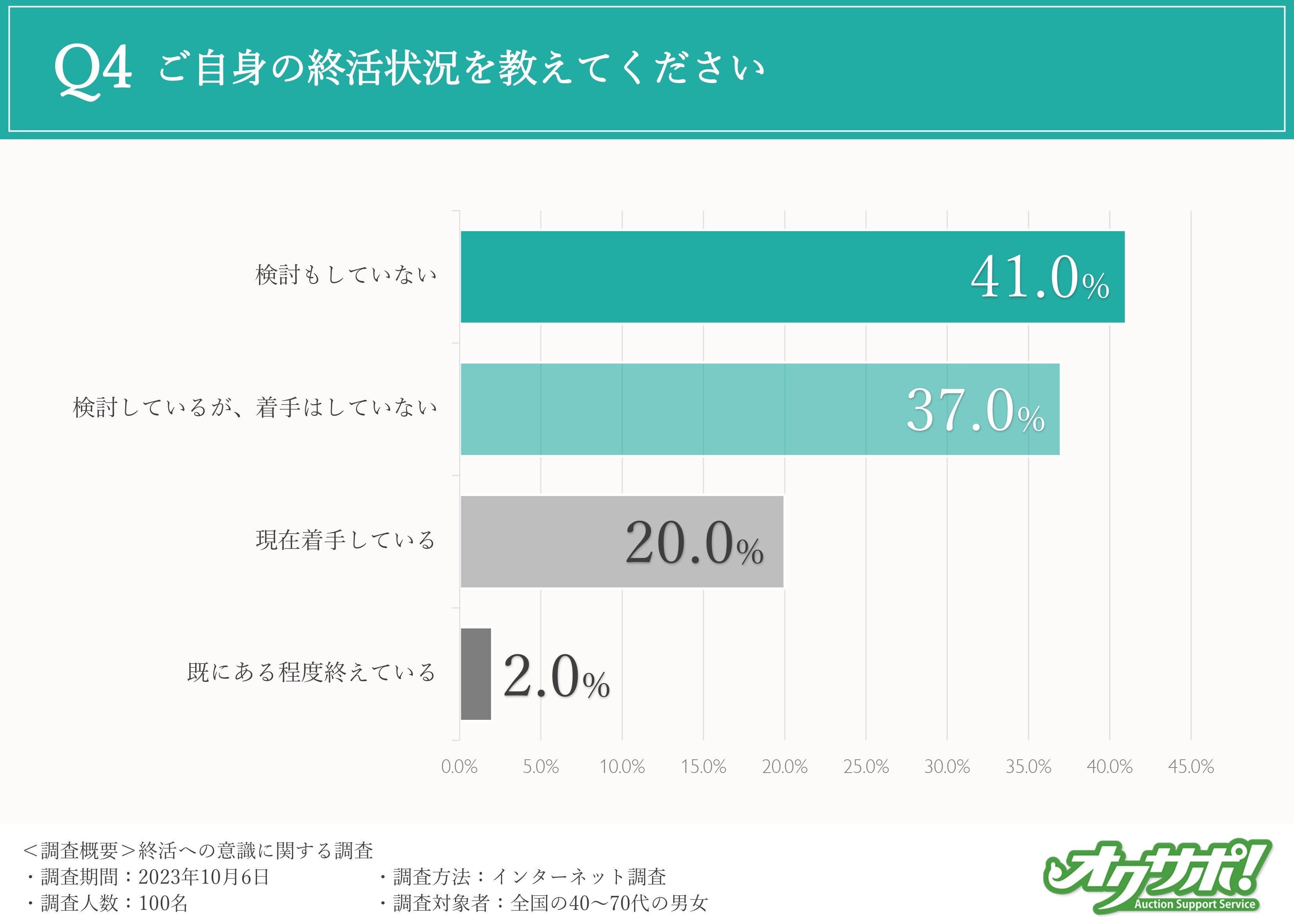 一方で、「検討しているが、着手はしていない(37%)」「現在着手している(20%)」「既にある程度終えている(2%)」と回答した方もいたことから、40代以上の方の半数以上は何らかのアクションを起こしている様子が伝わる結果となりました。