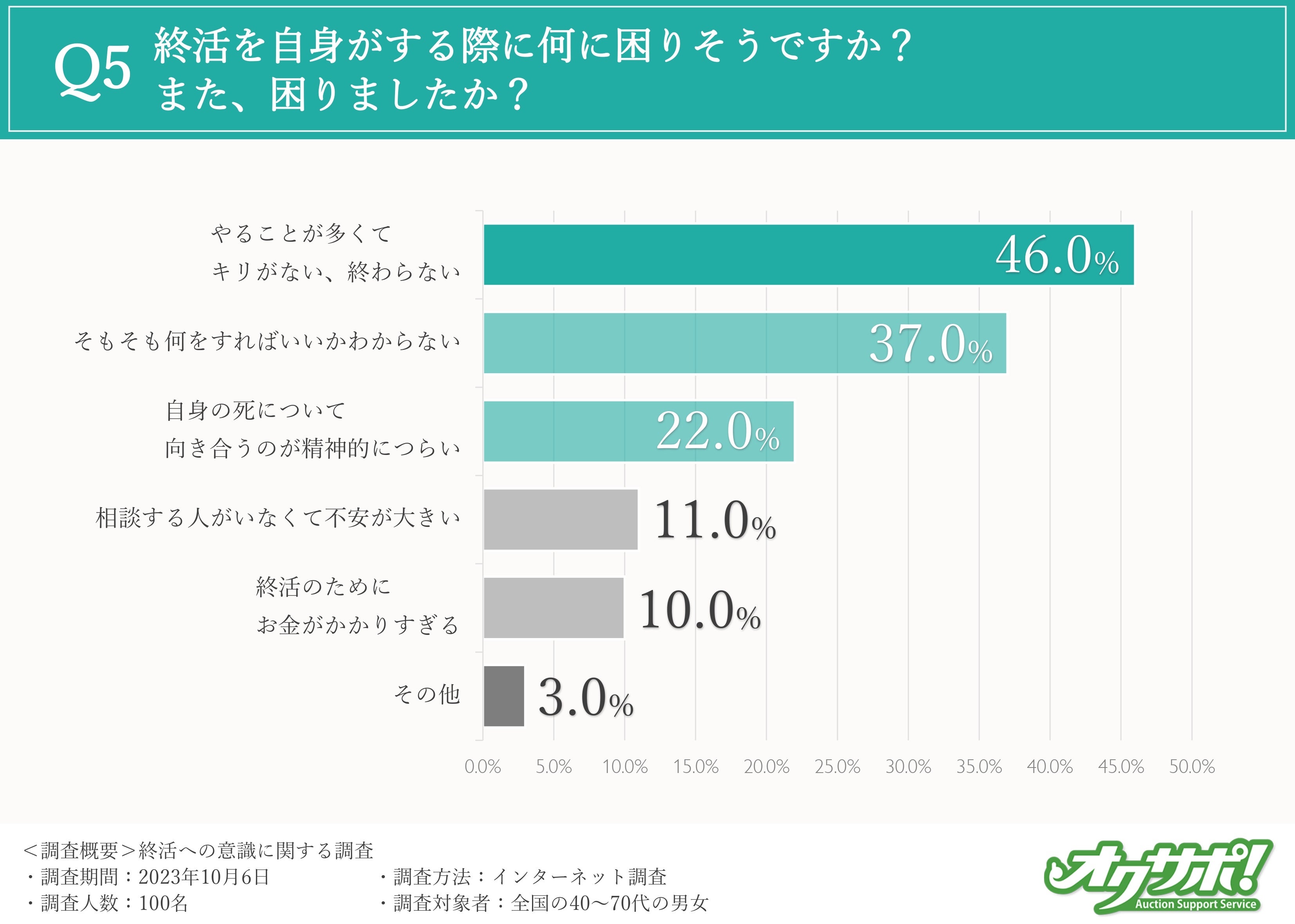 また、「自身の状況を整理しておくため(50%)」という回答も半数の方が答えており、残された家族のためだけでなく、ご自身の残りの人生をよりよく生きる終活というイメージを持っている方も多いことが読み取れます。