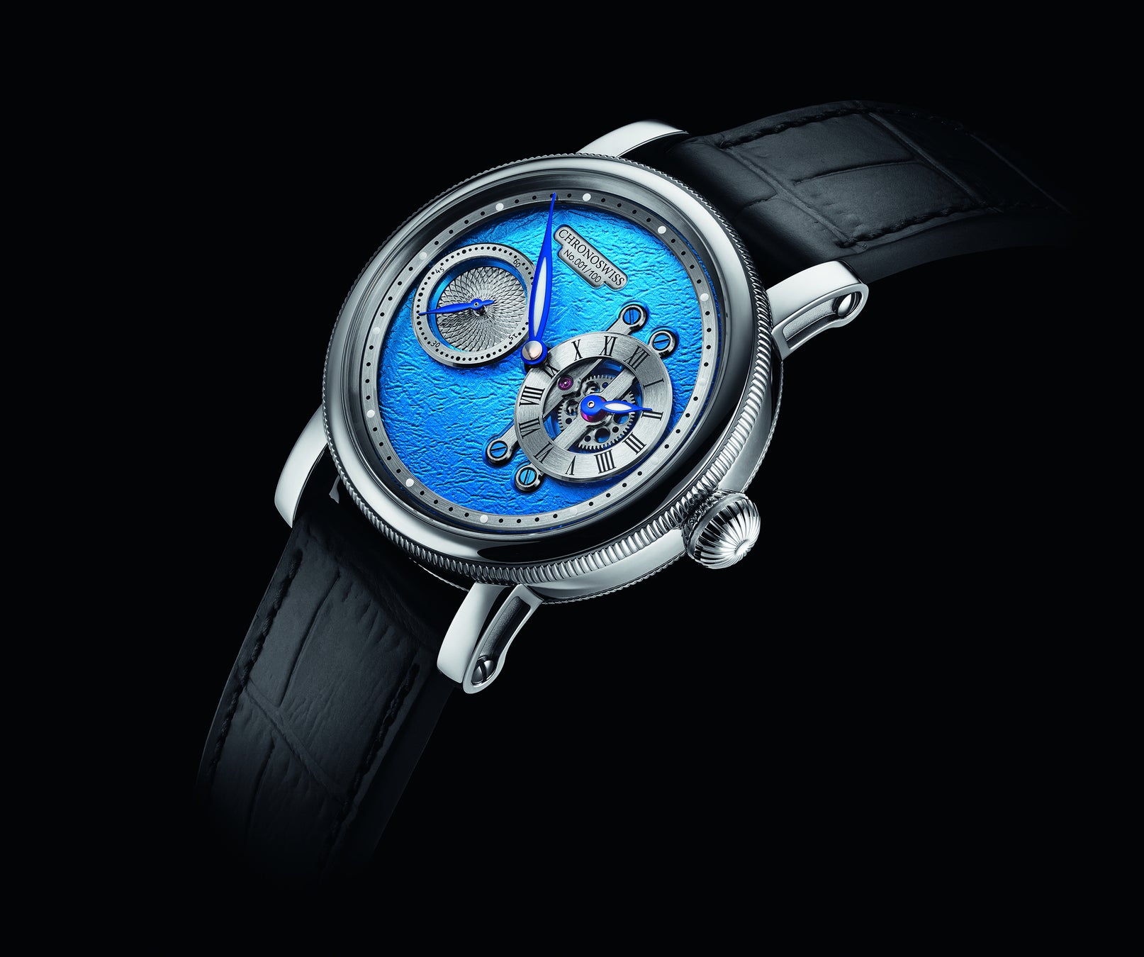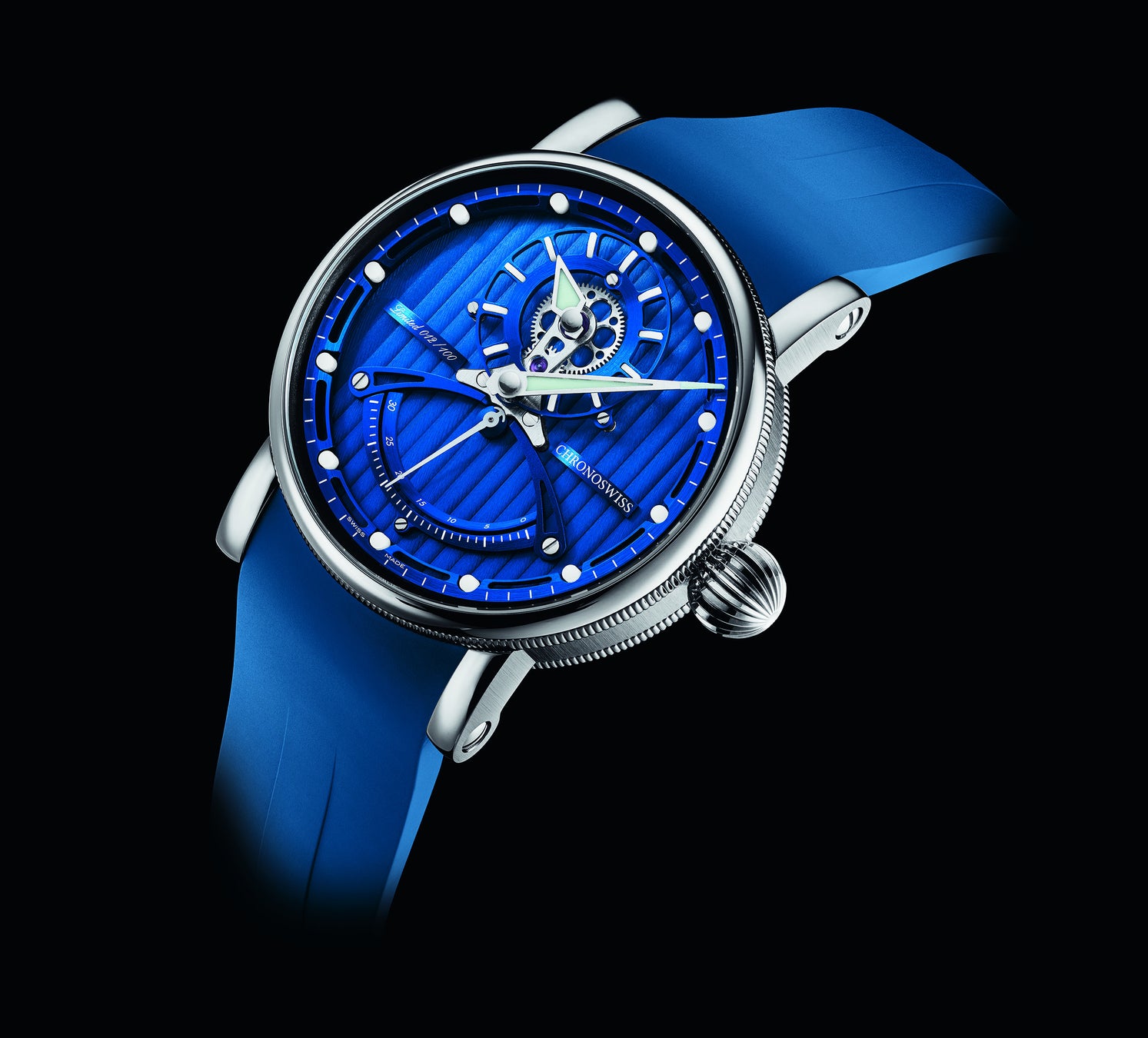 先進的なデザインと印象的な3Dライトブルーのダイヤルが美しい「H2O」。クロノスイスの伝統的な技術と現代的なセンスを融合させたモデルです。