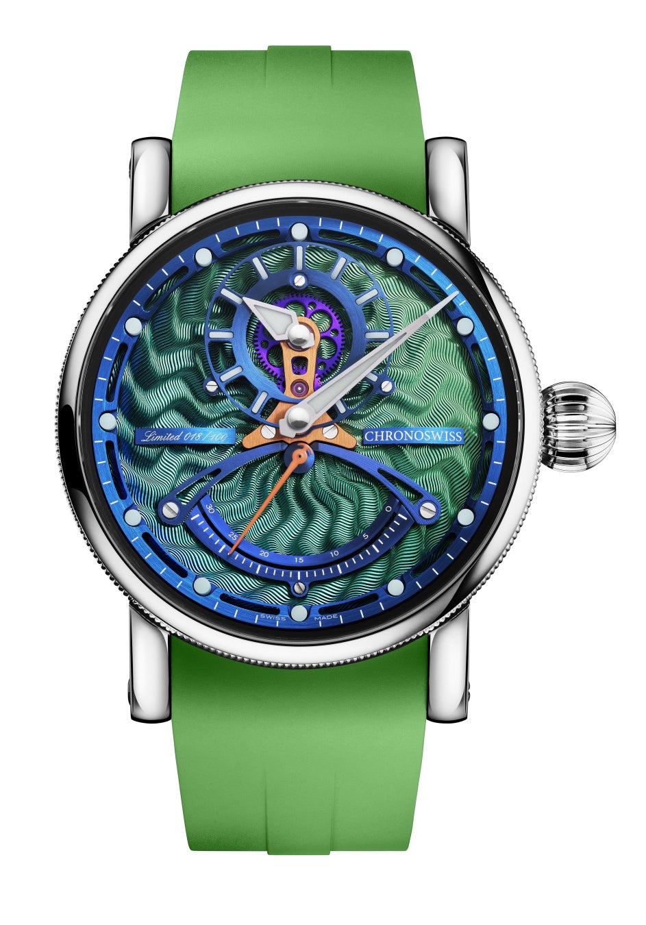 レ・セック マニュファクチュール シリーズの新作「グリーン モンスター」「バーティカル ブルー」は、新たに、‘ラ・ジュー・ペレ’と共同開発した自社開発ムーブメントを搭載しました。画期的なムーブメントとより軽量で強力な素材を追求し、洗練されたダイヤルデザインを備えたタイムピースは、クロノスイスの新たな一歩となります。