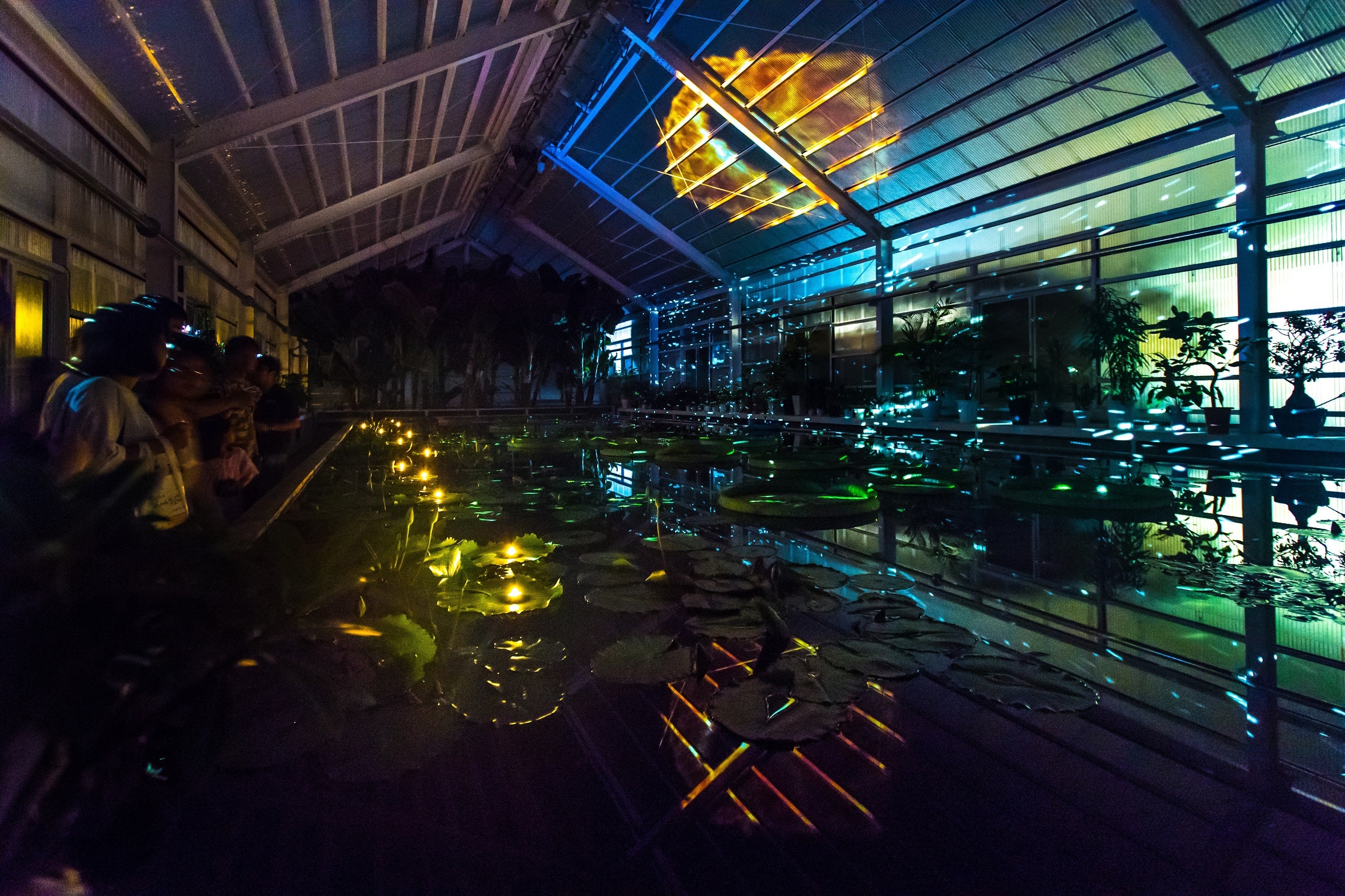 水面いっぱいに広がる大鬼蓮。水音に合わせて幻想的な光の粒が踊っています。鬼のイビキが静かに響く中、ふと天井を見上げると鬼の大目玉が!!