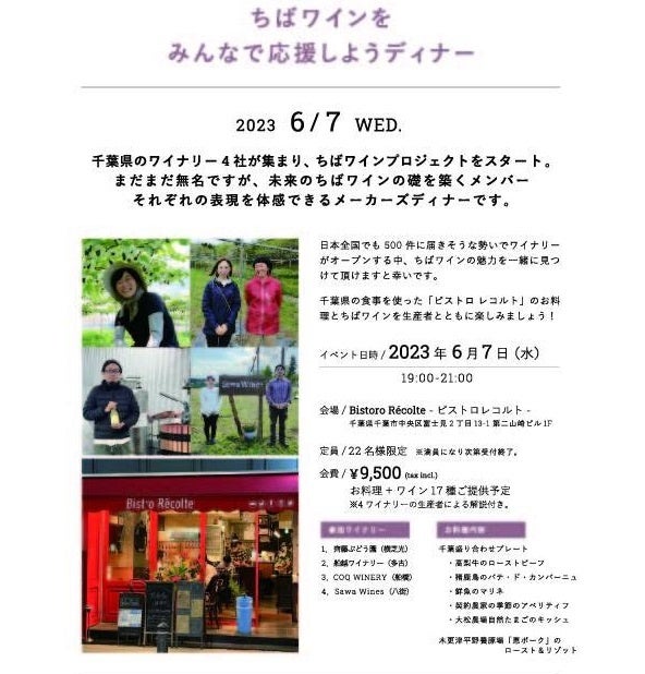 【千葉】千葉ワインを応援!Bistro Récolte(ビストロレコルト)にて【#ちばワインヌーヴォーPARTY 2023】を11月29日(水)に開催!!