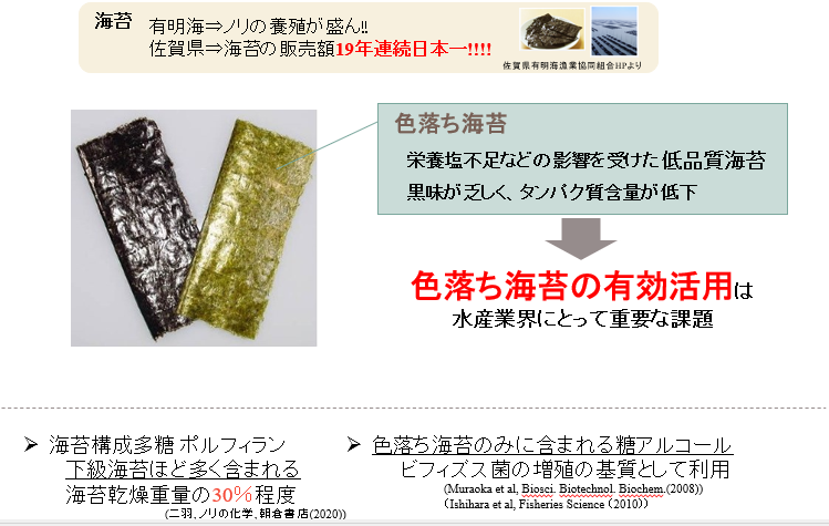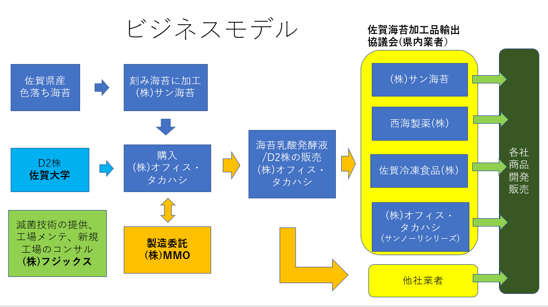 佐賀海苔加工品輸出協議会(2020年11月設立)です。(メンバー:株式会社サン海苔(松尾社長)・西海製薬株式会社(権藤社長)・佐賀冷凍食品株式会社(古賀会長)・株式会社オフィス・タカハシ)協議会の発足により商品開発は加速度的に進み、2023年12月末の免疫賦活作用がある色落ち海苔乳酸菌発酵液の工業生産化にたどり着くことができました。元松尾参事の呼びかけから5年の歳月です。
