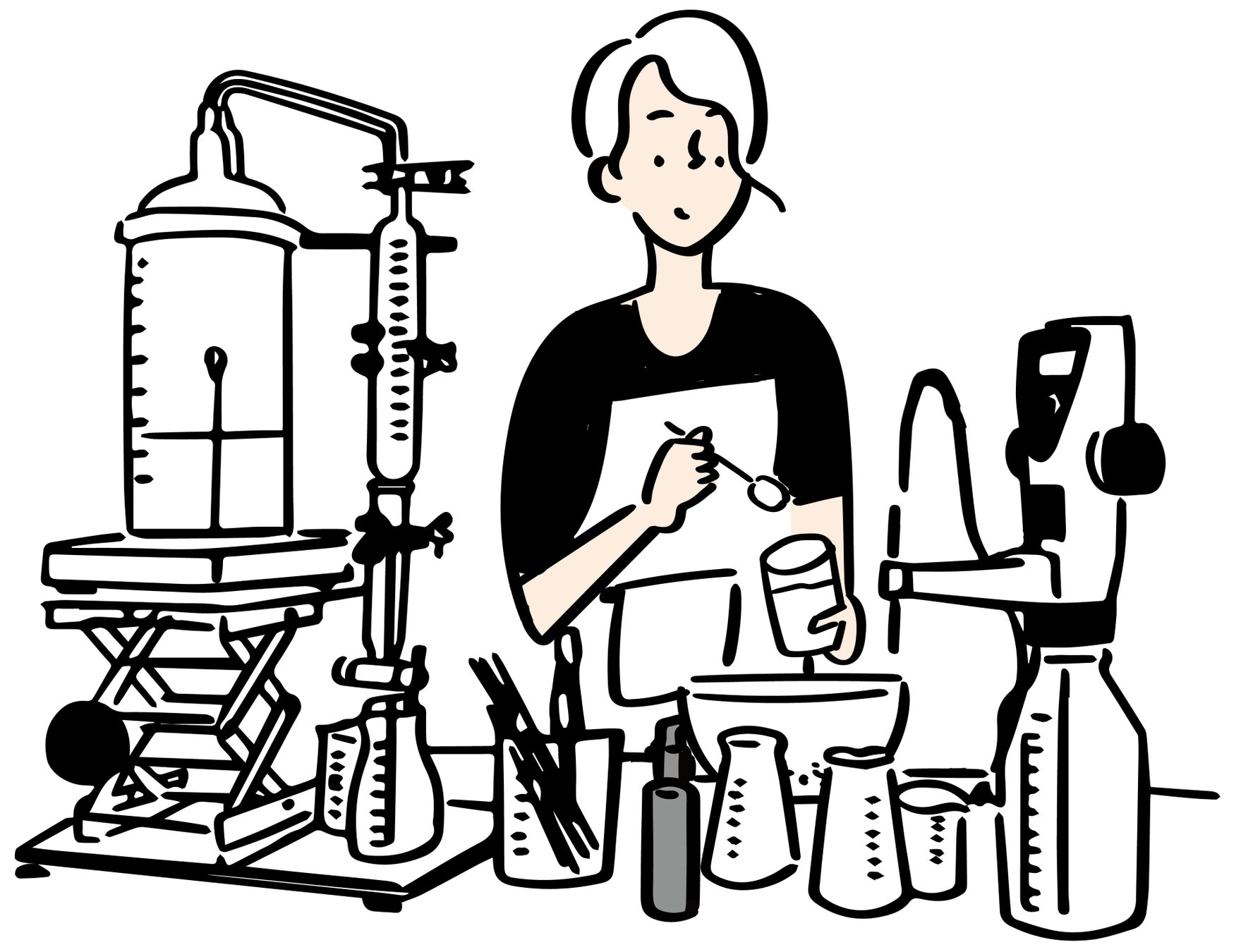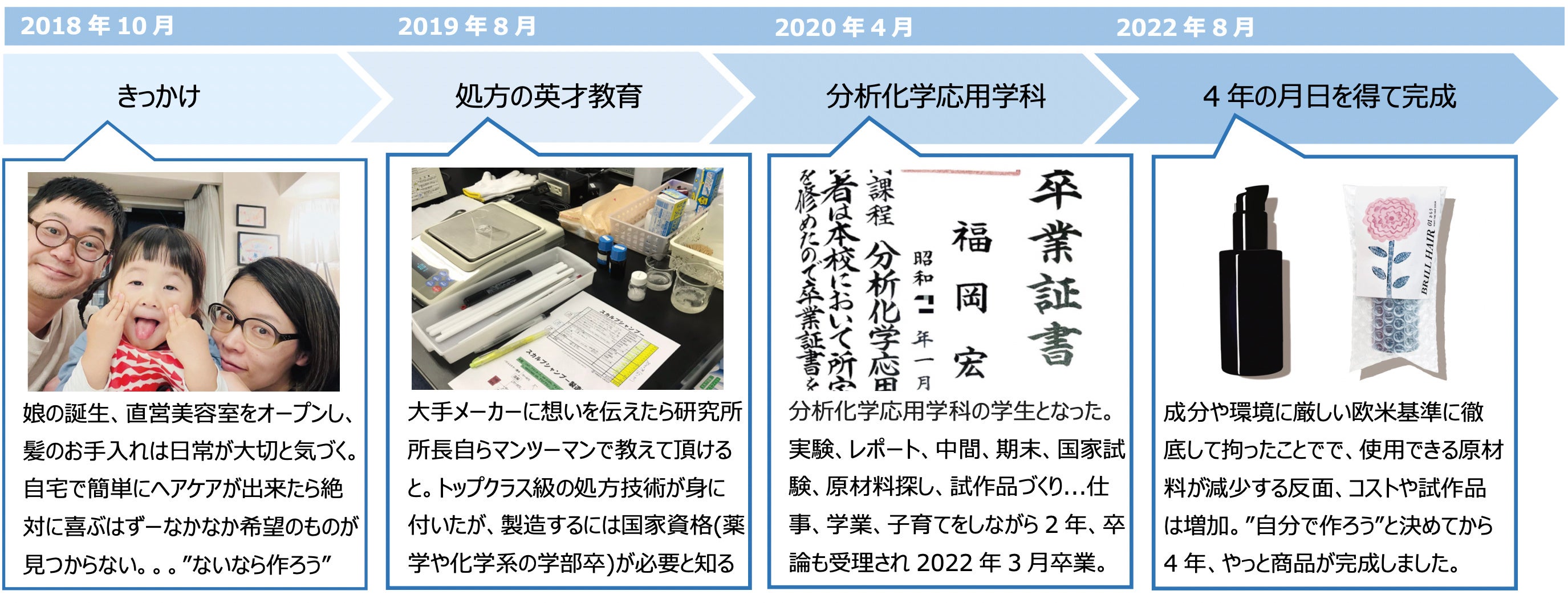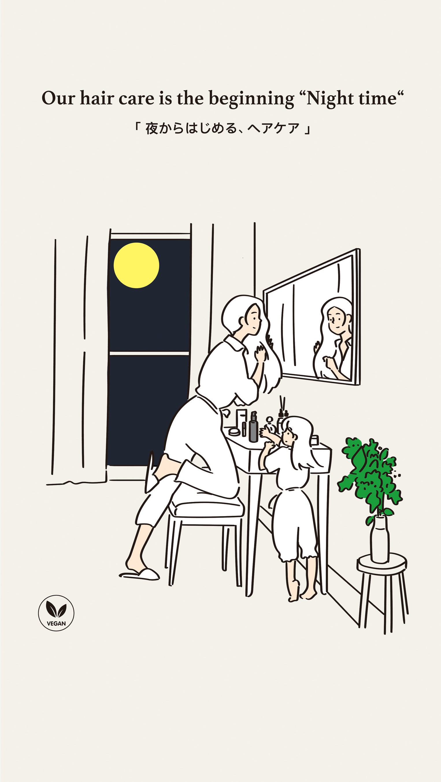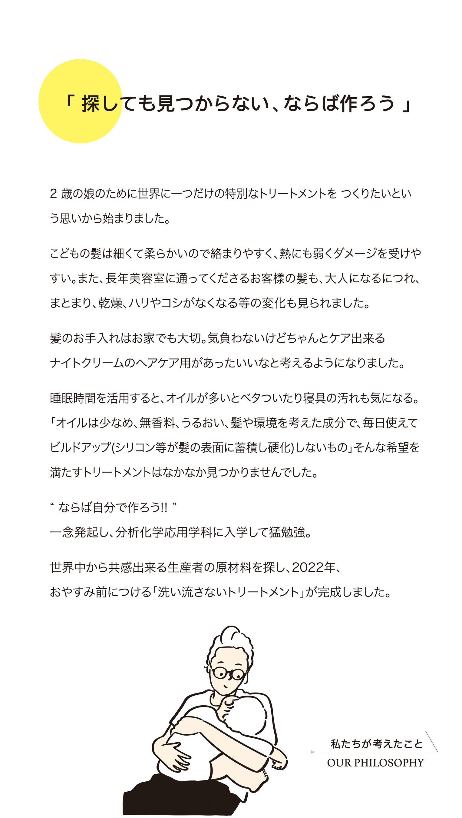 “ ならば自分で作ろう!! ” 一念発起し、分析化学応用学科に入学して猛勉強。世界中から共感出来る生産者の原材料を探し、2022年、 おやすみ前につける「洗い流さないトリートメント」が完成しました。