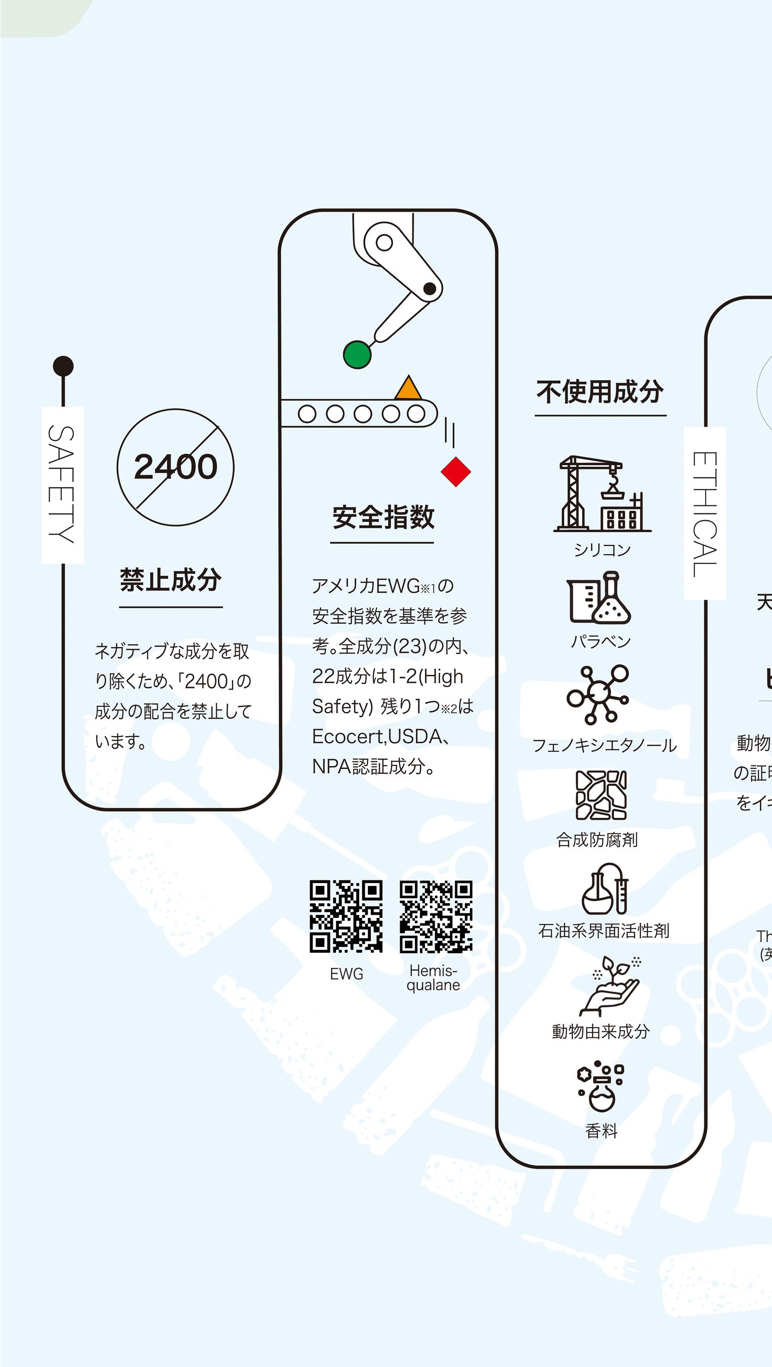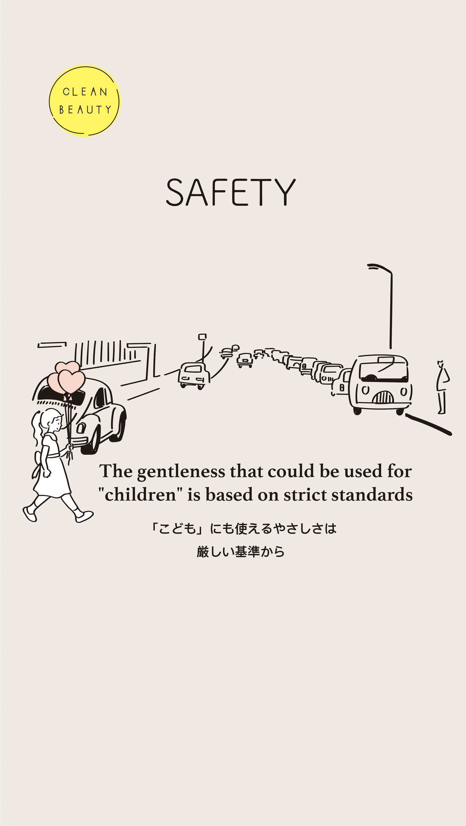 開発において一番初めにしたことは、少しでもアレルギーやアトピーのリスクを減らすためネガティブな成分を取り除くことでした。 世界でも厳しい化粧品規制を実施しているEUの禁止成分※1は1637(2021年度)、私たちが禁止している成分は 「 2400 」。 この厳しい基準は、こどもにも使える優しさを第一に考えた私たちのスタンダードです。また化粧品成分の基準に厳しいアメリカEWG※2の安全指数基準を参考。不使用成分(シリコン、パラベン、フェノキシエタノール、合成防腐剤、石油系界面活性剤、動物由来成分、香料)