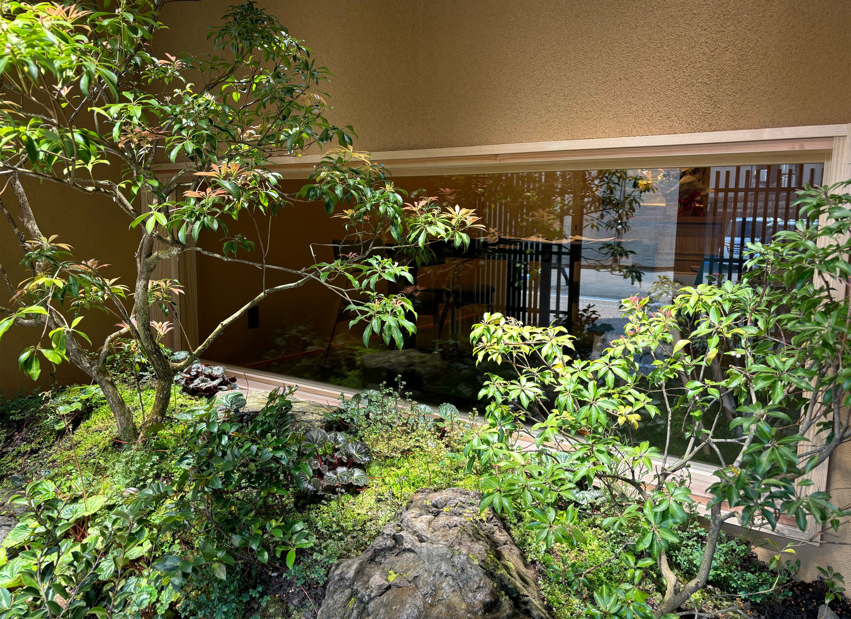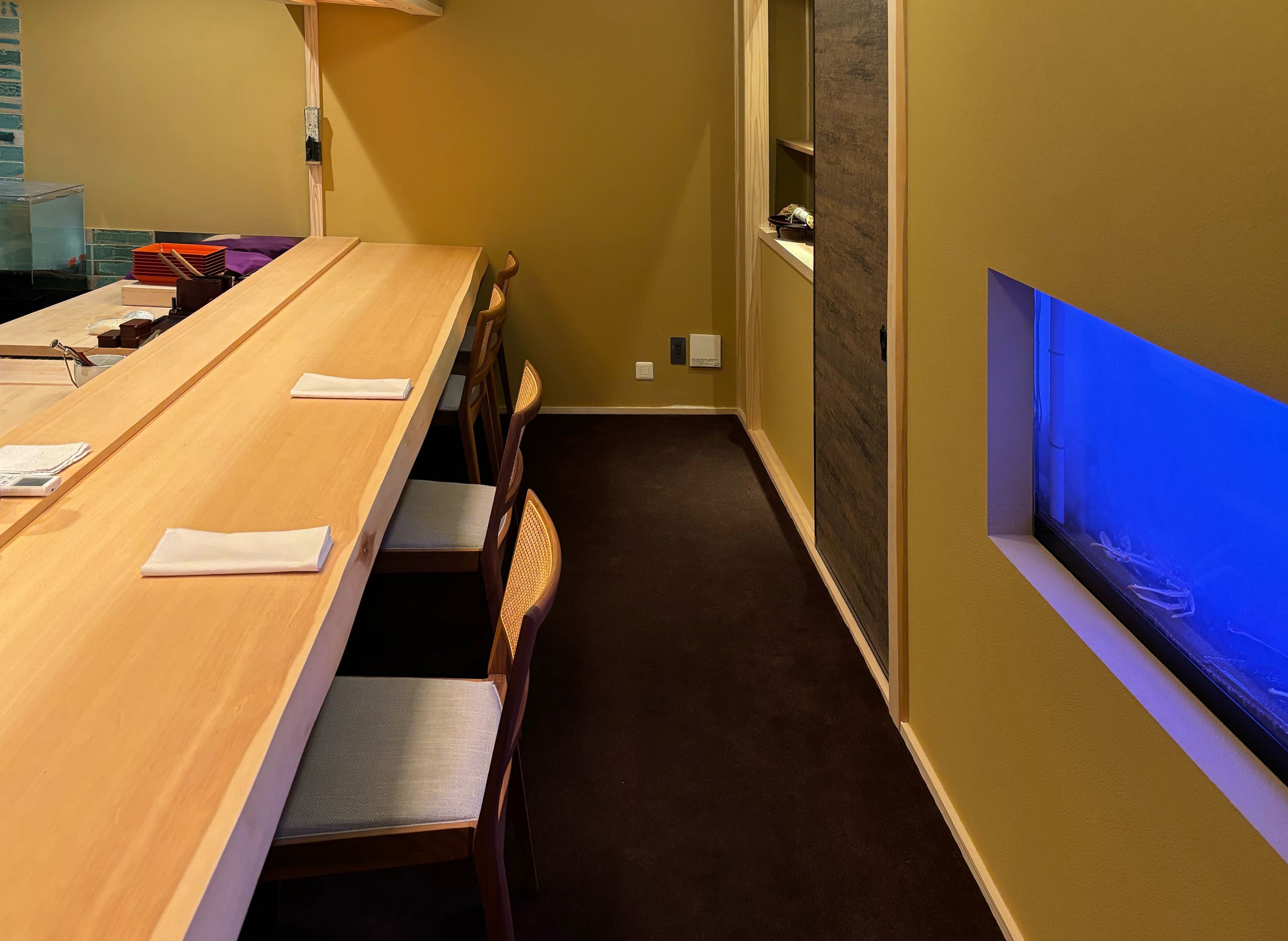 正面よりお客様をお迎えする青々した苔が特色のお庭、通路沿いに設置の生け簀の魚介を眺めながら店内に、臨場感溢れるカウンター席の他、お庭を眺めながらゆったりとご会食いただける個室もご用意しております。