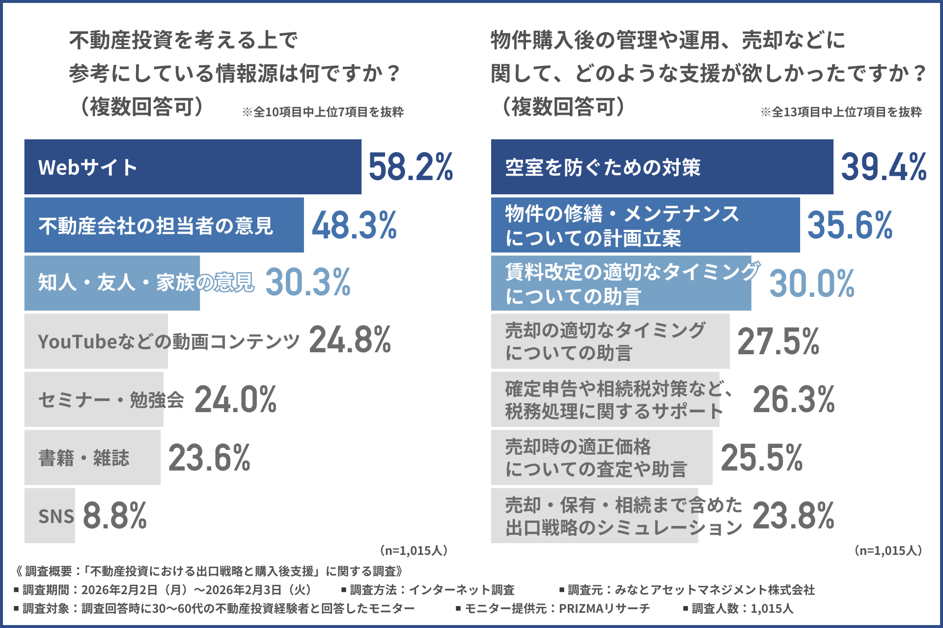 みなとアセットマネジメント株式会社(所在地:東京都港区、代表者:向井 啓和)は、30〜60代の不動産投資経験者を対象に「不動産投資における出口戦略と購入後支援」に関する調査を行いました。