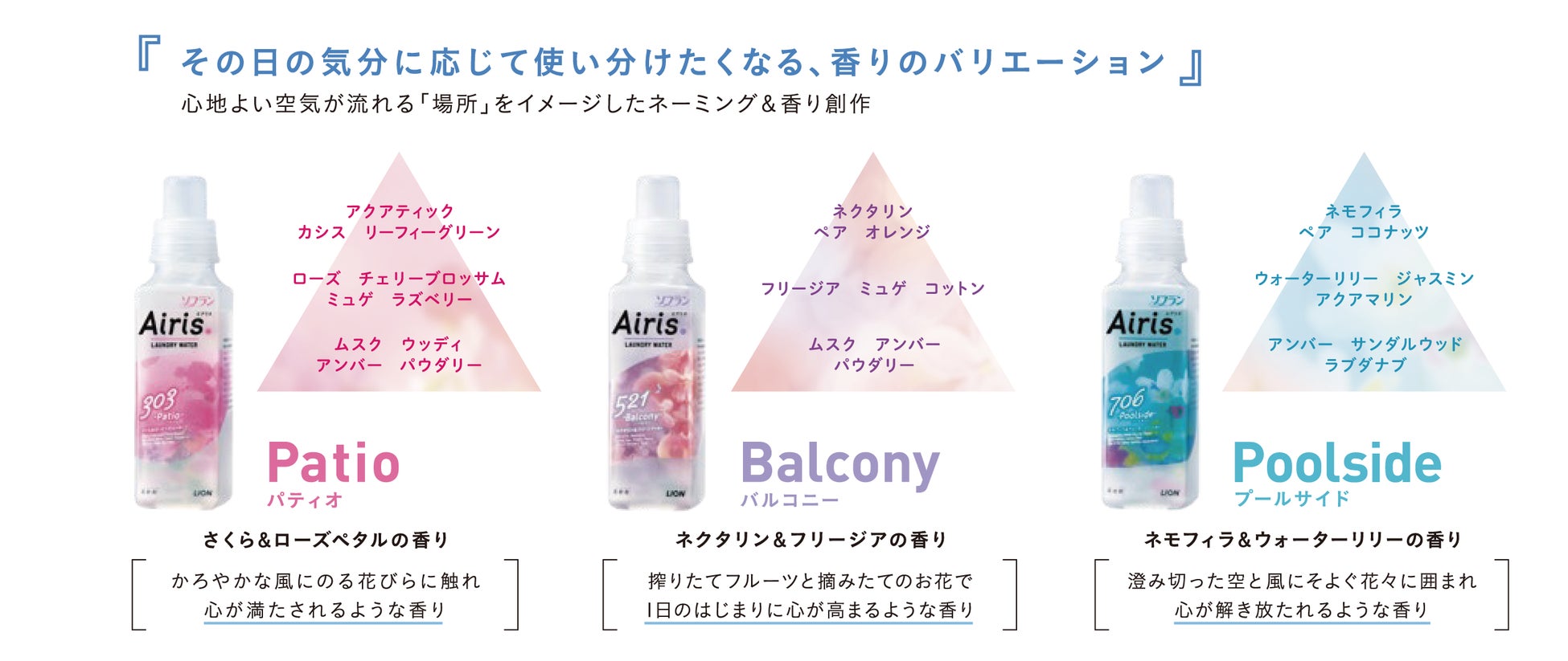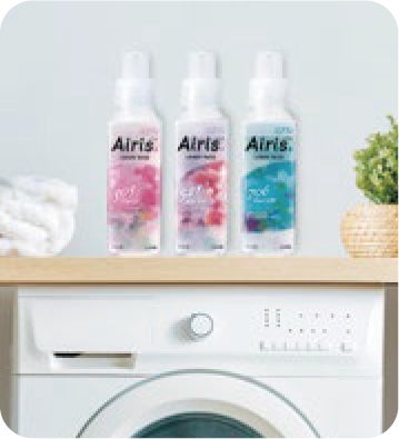 これらの生活者の潜在的な欲求から、「洗濯と毎日を解放的でかろやかにするエアリー体験」という新たなコンセプトを設定し開発したのが、<新感覚>柔軟剤、ランドリーウォーター『ソフラン エアリス』です。水のようにピュアで解放感を感じさせる澄み切った透明な液剤の『ソフラン エアリス』は、エアリー体験をあらゆる感覚から感じていただけるように設計しました。透明な液剤がもたらす視覚的新感覚に加え、「そよ風のように広がるかろやかな“香り”」「空気のようにさらりとした“着心地”」そして「ランドリールームを彩る“デザイン”」。複合的に新しい感覚をもたらす『ソフラン エアリス』は、仕上がりだけではなく、洗濯時間というプロセスにおける気分、そして空気までもかろやかで、前向きなものに変えていきます。