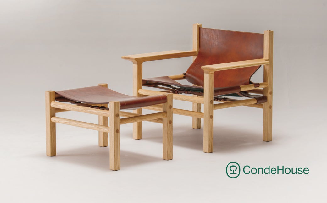 北海道当麻町産のミズナラ材と「ソメスサドル」の一枚ものの厚革を組み合わせた、特別仕様のイージーチェアーとオットマンのセットが3セット限定でふるさとチョイスに再登場!