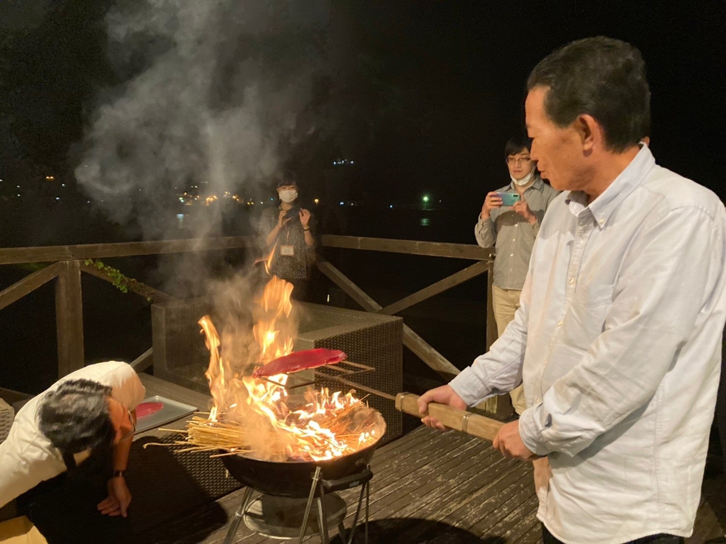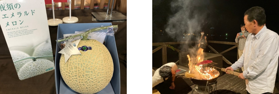・夕食:カツオの藁焼きたたき体験。地元の高級魚・シイラや、夜須のエメラルドメロン、ニラ塩焼きそばなど、地元の特産品を使った料理を堪能。