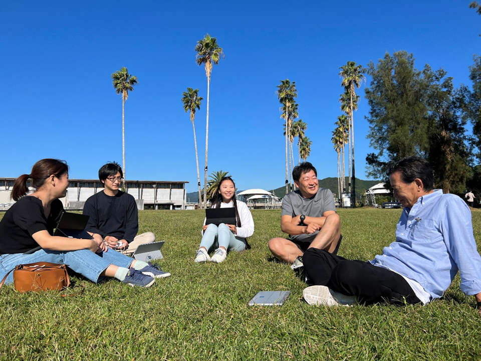 ・執務:午前9時から執務開始。時折、屋外のヤシの木のもとや土佐湾を臨む芝の上など、各々が思い思いの場所で執務に励む。