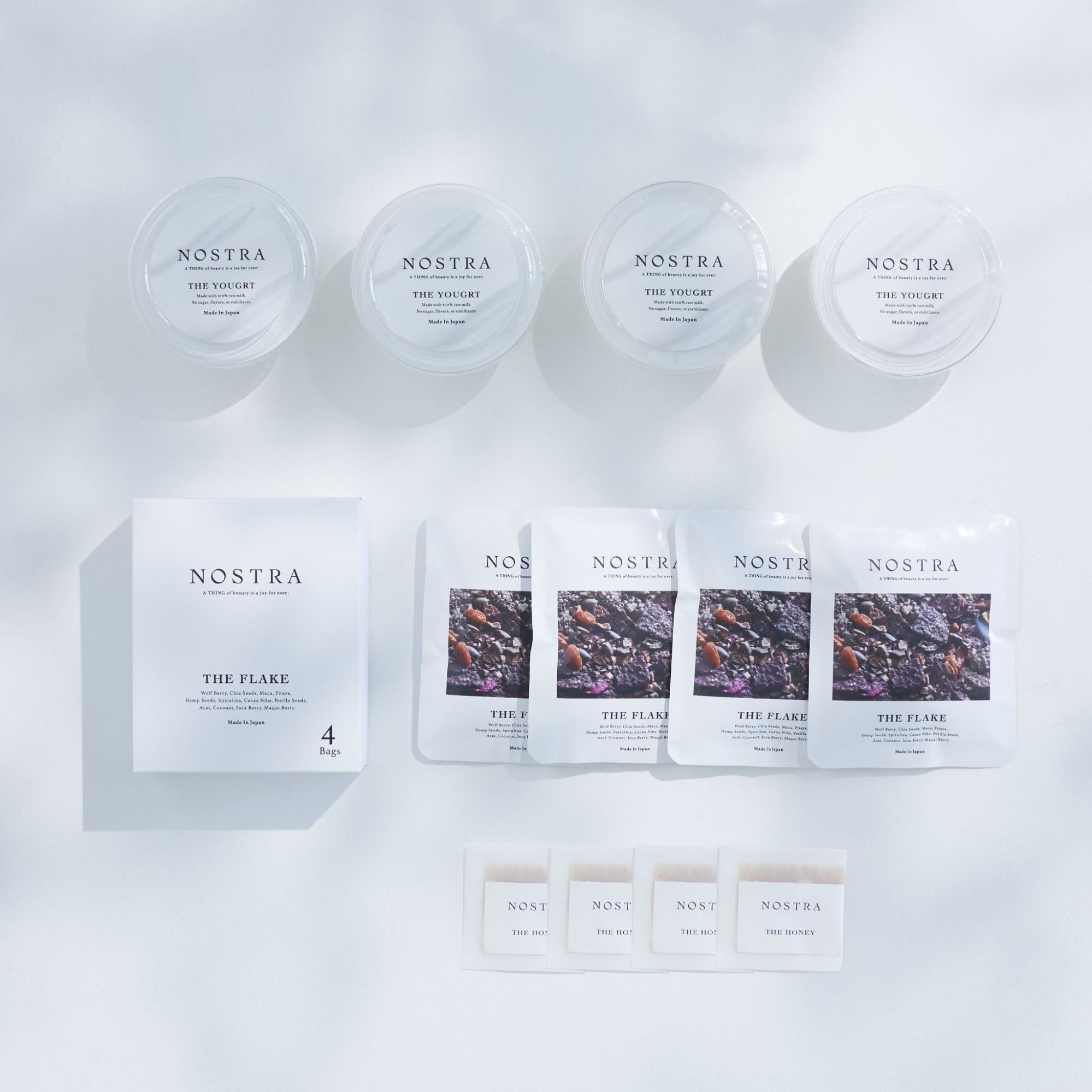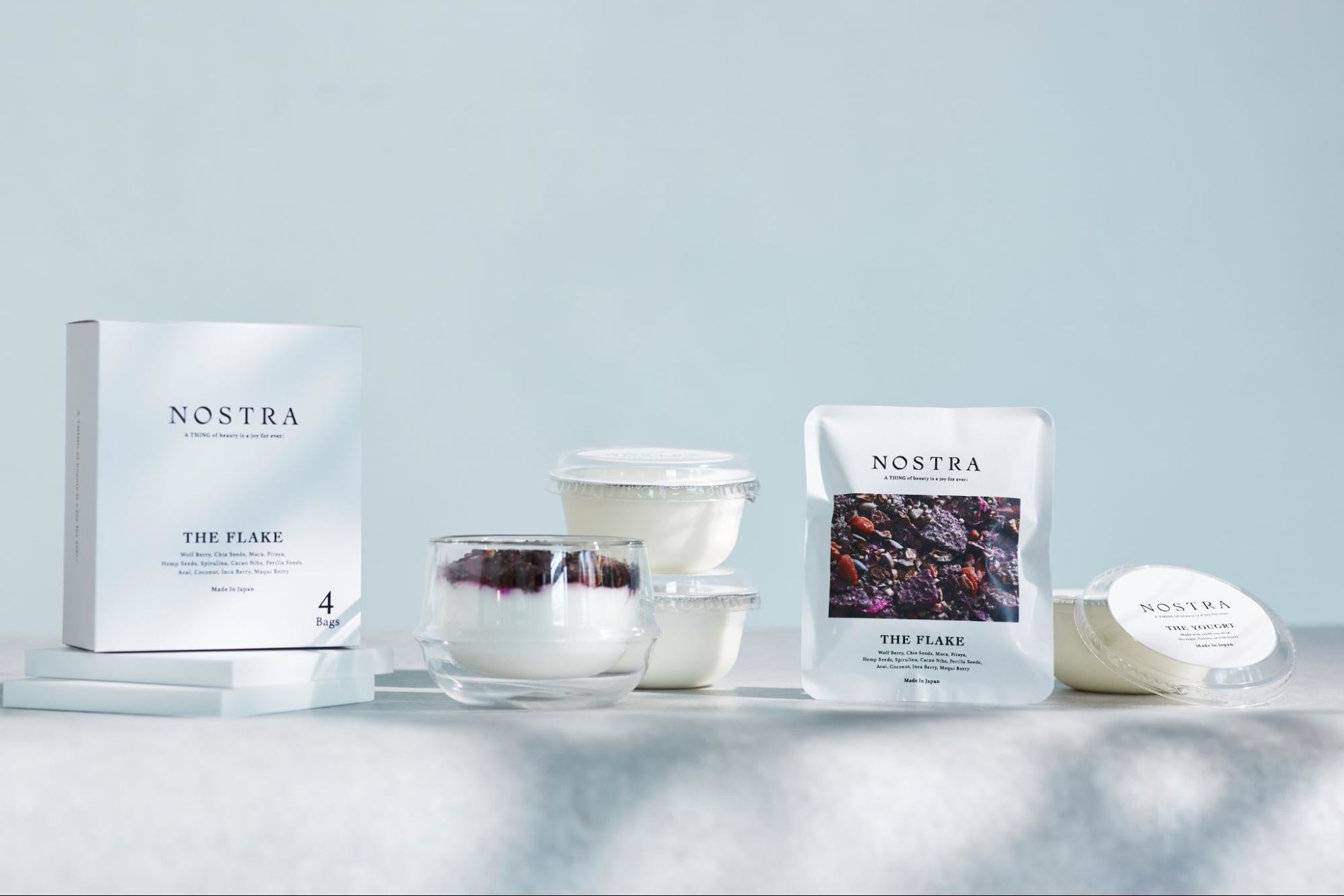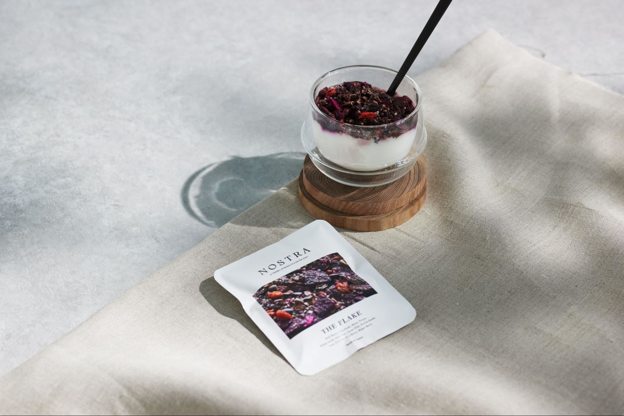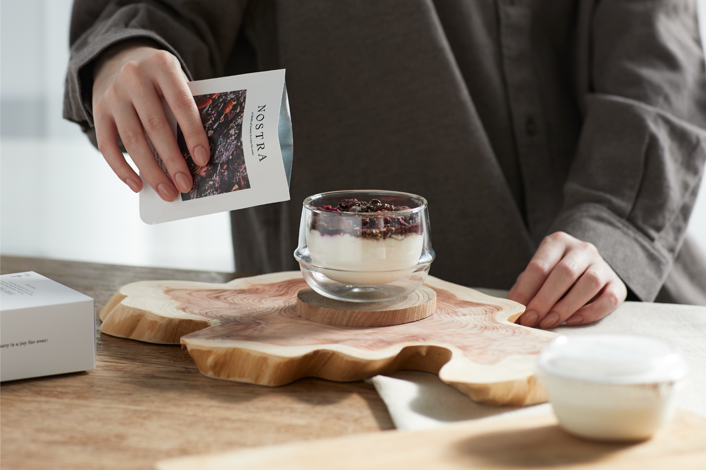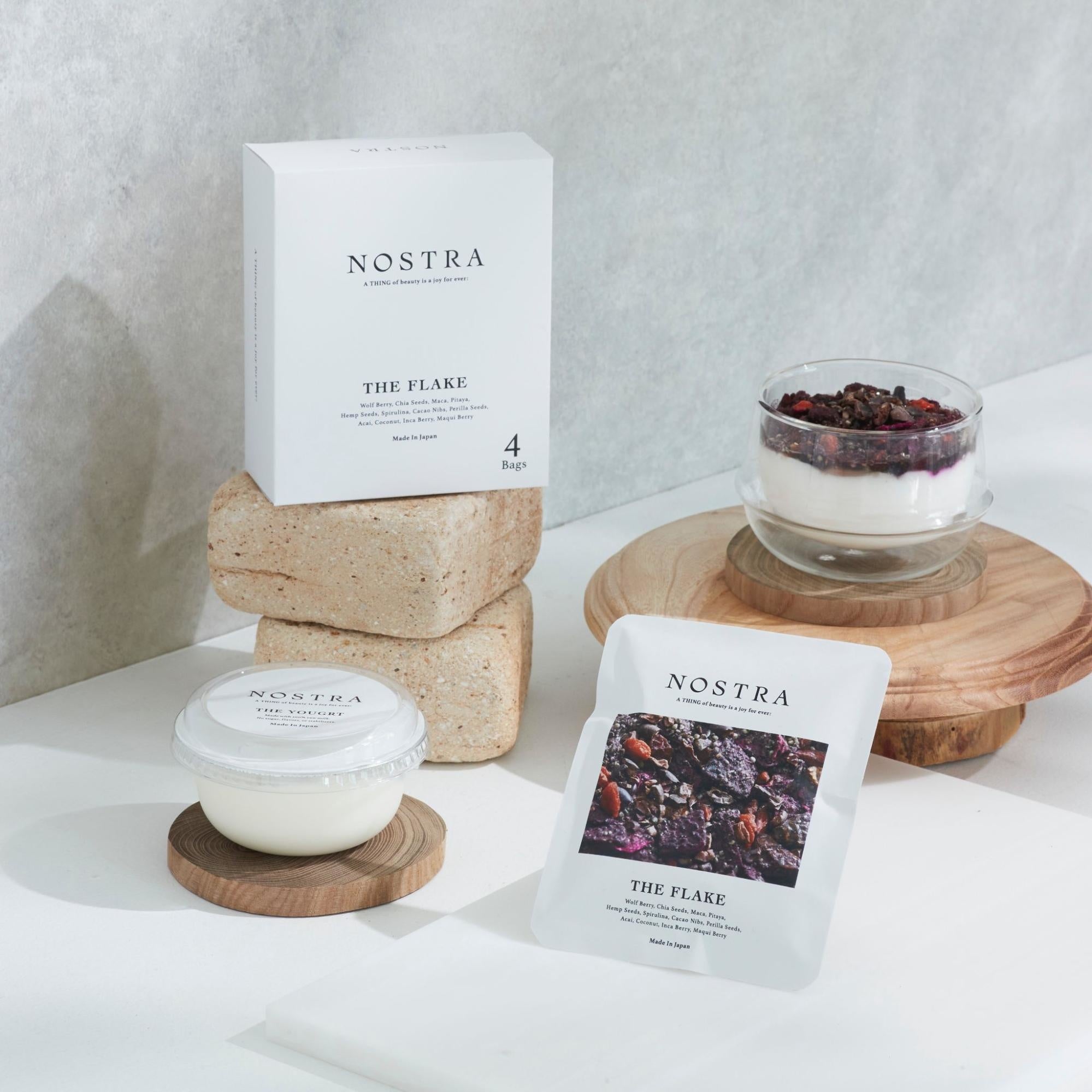 NOSTRAは、選りすぐった12種類のスーパーフードを使用したフレークに、ヨーグルト、マヌカハニーを合わせた新感覚のスイーツ。東京・六本木にある『Patissiere MAYO』代表の宮田真代さんにレシピ監修を、Men’s Clara Clinic院長の神林由香さんに医療監修いただくことで、おいしさと豊富な栄養バランスを考え抜いた、心も身体も喜ぶ一品が誕生しました。