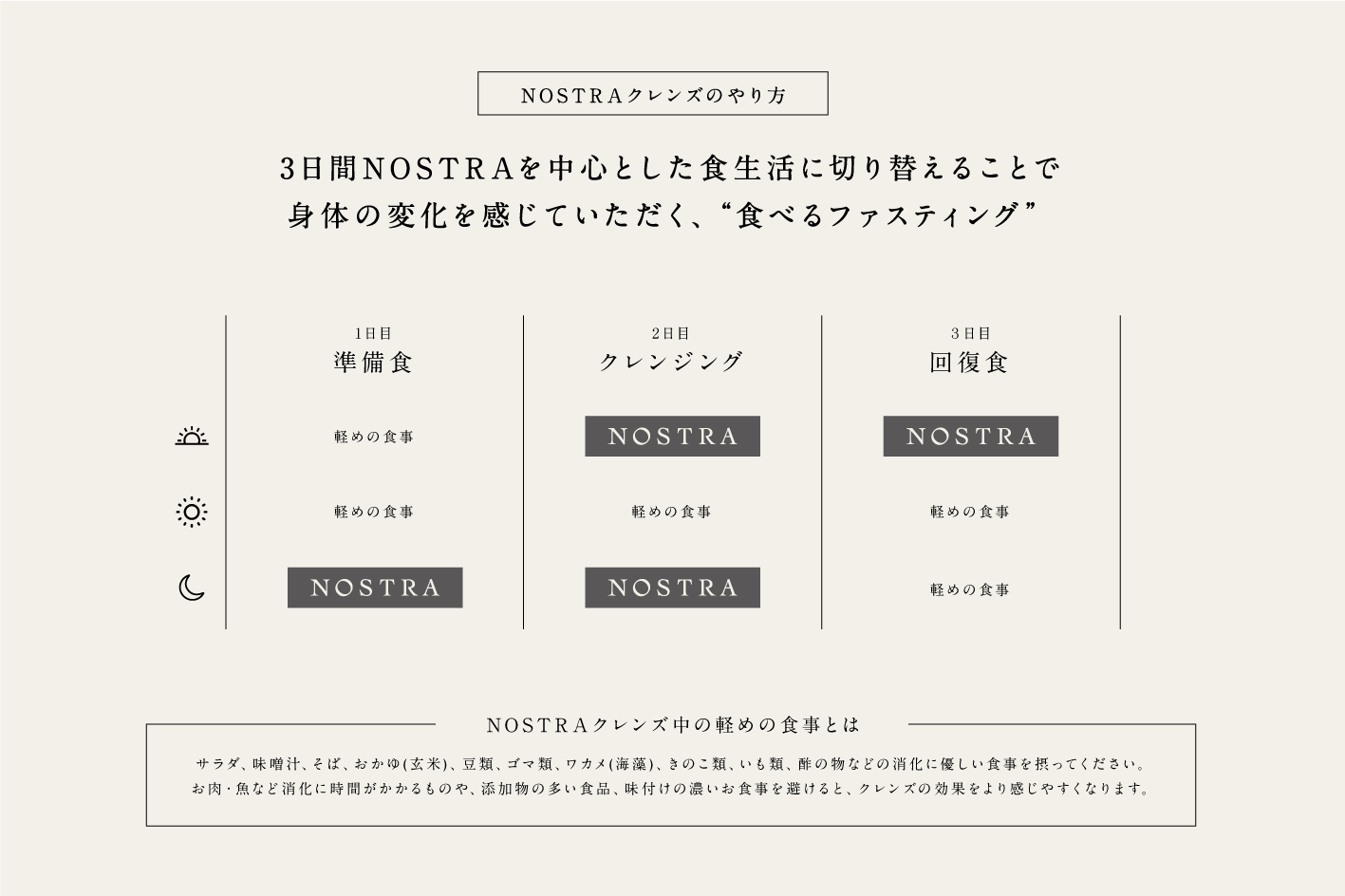 回復食期間はクレンズの効果をより高めるために必要不可欠。クレンジング翌日の朝ご飯をNOSTRAに置き換えて、すっきりとした胃を徐々に慣らしていきます。