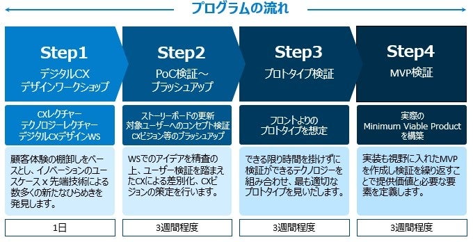 本プログラムは、新規サービス創出や既存サービスの改革、組織の改編を進めるためのアイデア創発からその実現までを、「デジタルCXデザインワークショップ」「PoC(概念実証)検証」「プロトタイプ検証」「MVP(Minimum Viable Product:実用最小限の製品)検証」の4つのステップに分け、それぞれをNTTデータ先端技術が伴走支援することで、お客様のCX(Customer Experience:顧客体験)変革の実現を目指すものです。