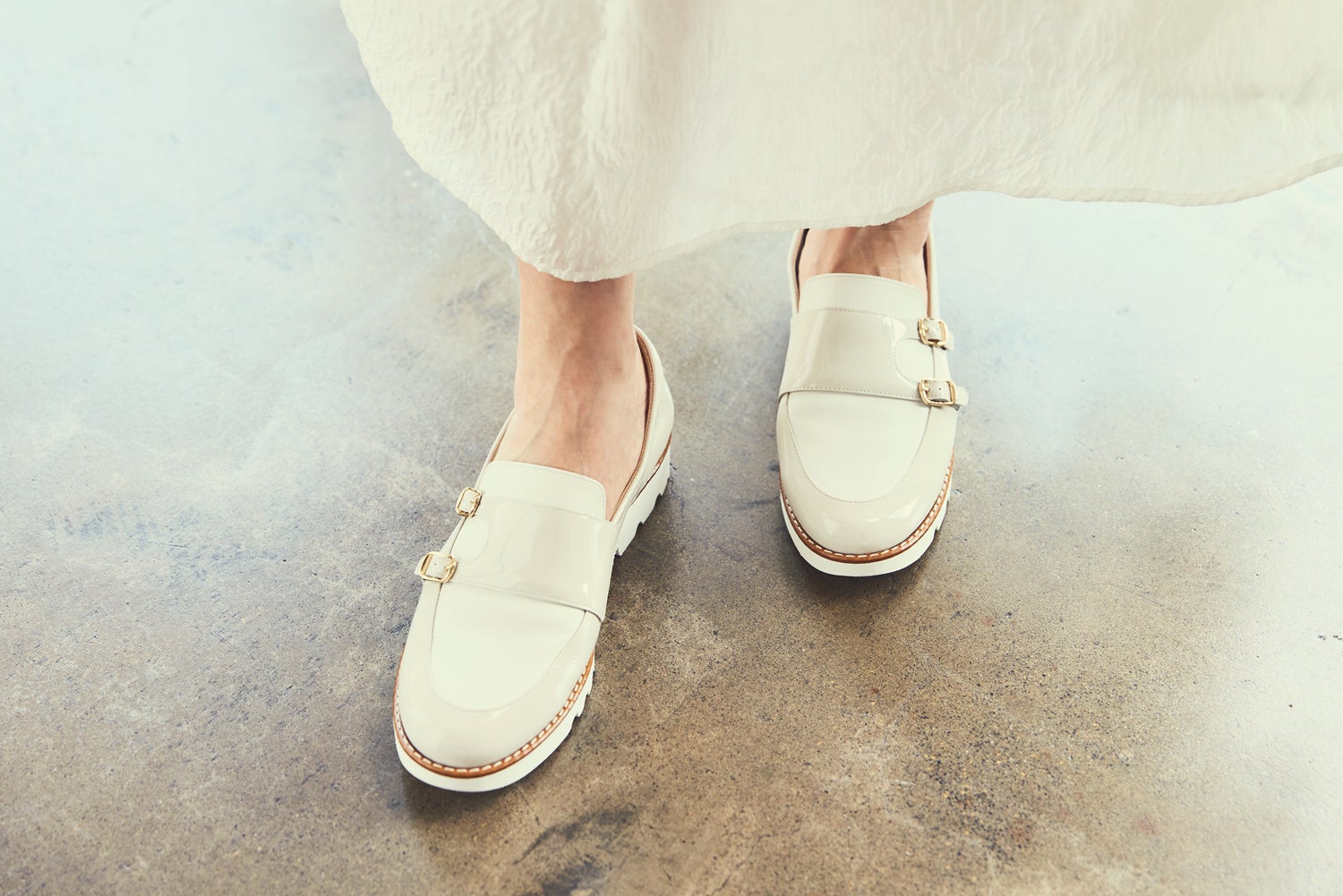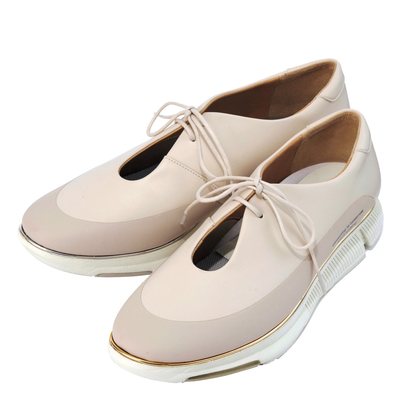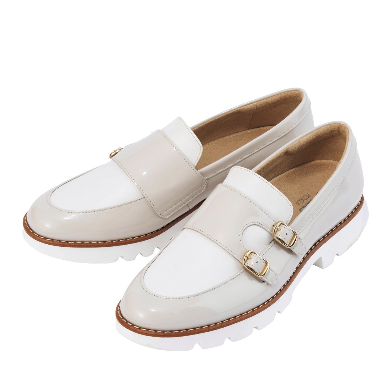 アッパー(甲被)のエナメル部分をニュアンスグレーにすることで、上品な印象に仕上げました。さりげなく光るゴールドの金具が足元に華やかさをプラスし、コーディネートのアクセントになります。甲部分はホワイトとニュアンスグレーのコンビになっており、白いボトムスや春らしいきれい色のアイテムとも相性がよく、ビジネスからカジュアルまでさまざまなシーンで着用いただけます。