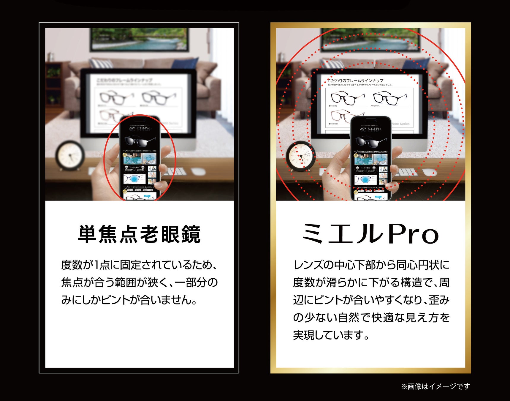 『ミエルPro』の累進多焦点レンズは、複数の度数が同心円状に配置され、中心から外側に向かって徐々に弱くなる構造。この構造により、手元から少し離れた場所まで見えやすく、老眼鏡を付け外すことなく快適に使用できます。