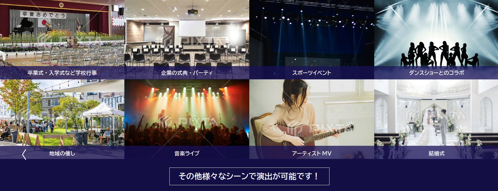 インドアドローンショーの魅力は天候のリスクがない点やコストだけではありません。インドアドローンショーは音楽との相性がよく、歌やダンスなどほかのエンターテインメントとも組み合わせることができます。また航空法など法律の規制を受けないため、準備~実施まで短期間で行うことが可能です。ほかにも小さなスペースで開催できる点など、屋外のドローンショーにはないメリットや魅力がたくさんあります。