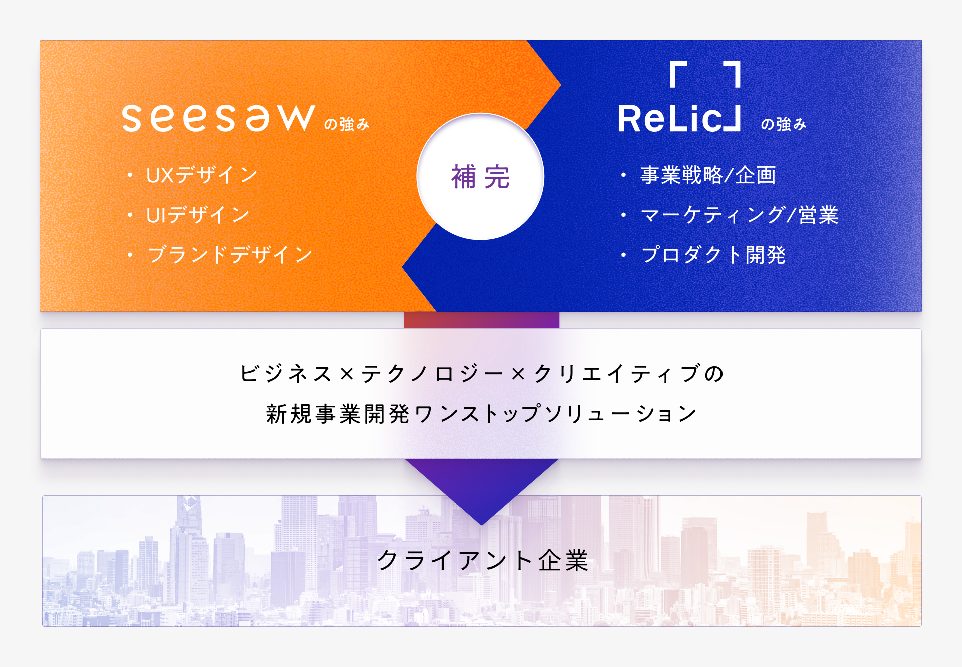UXデザインという考え方があたりまえに語られるようになった今、サービスの差別化にはブランドをどうデザインするのか?という視点が不可欠です。RelicとSEESAWの2社での包括的なサポート体制によって、新規事業開発を推進し、日本企業のさらなる発展に貢献していきたいと考えています。