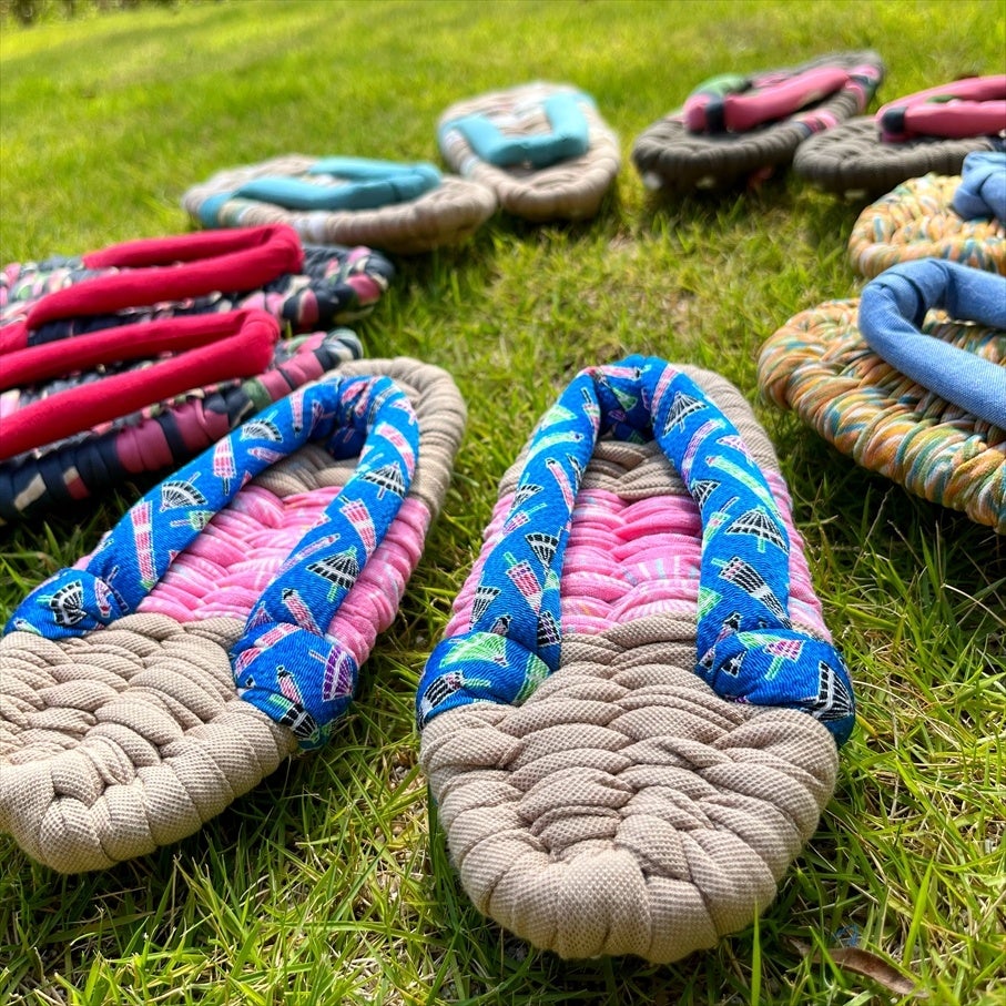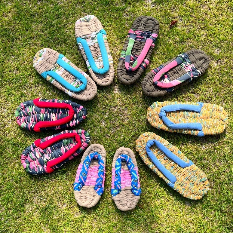 アウトドアで不要になったり、結局使わなかった衣類(Tシャツ)を材料に、御園工房の利用者さんの手で一つ一つ編まれた布ぞうりです。