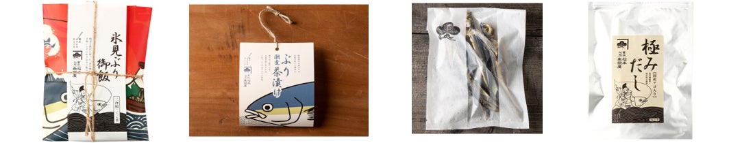 (左から、『氷見ぶり御飯』1,620円(税込)、『氷見ぶり茶漬け 甘露煮』756円(税込)、『あご焼干し』1,296円(税込)、『極みだし』1,620円(税込))
