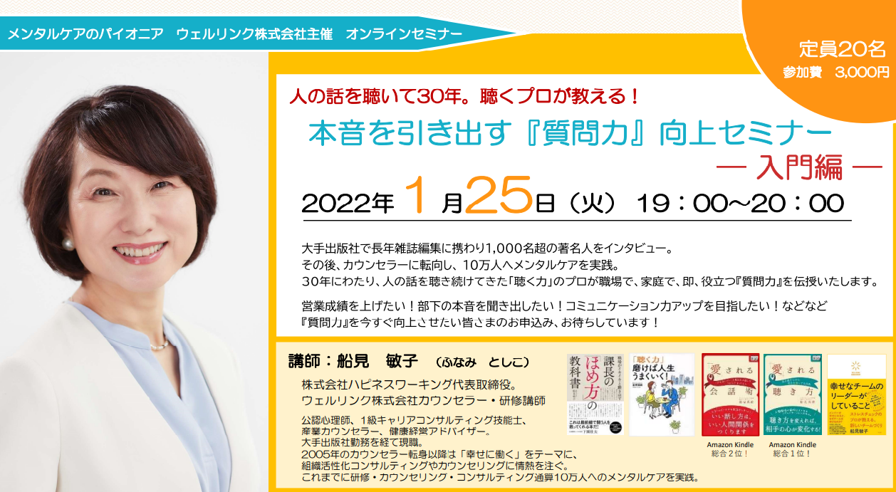 その後、カウンセラーに転向し、 10万人へメンタルケアを実践してきた『聴くプロ』が、職場で、家庭で、即、役立つ『質問力』を伝授いたします。