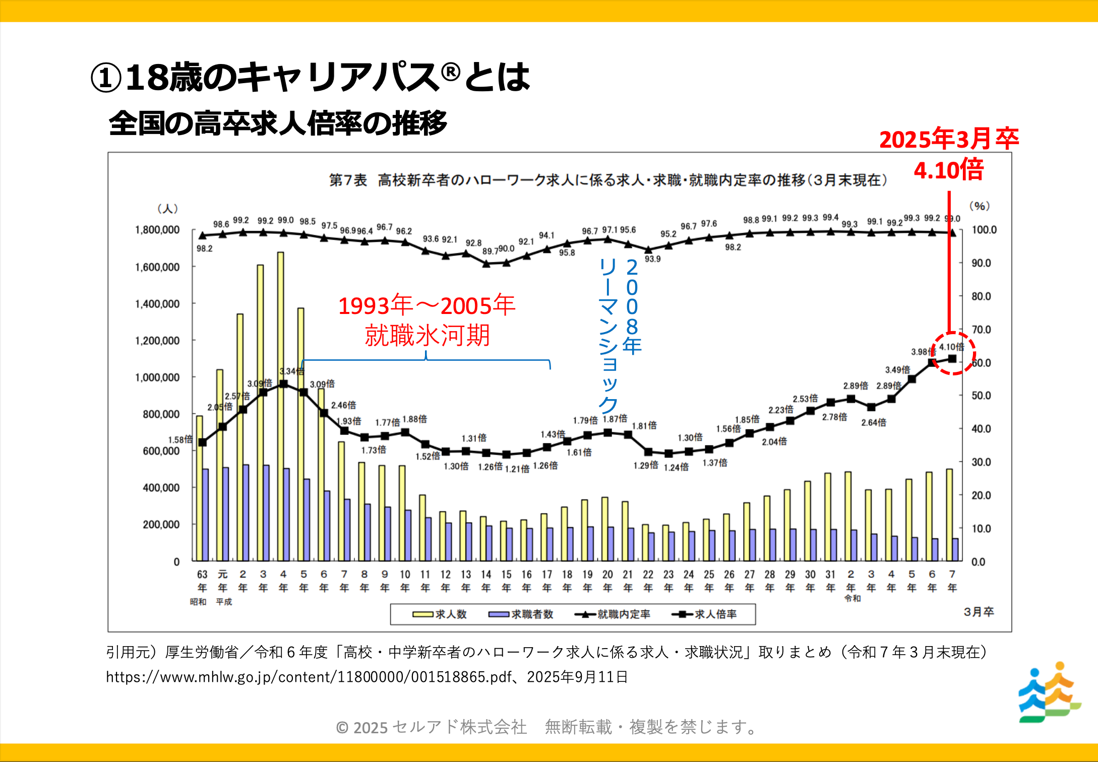 高卒求人倍率は4.10倍(中でも工業高校は30倍に迫る勢い)、高校新卒の3年以内離職率は37.9%。