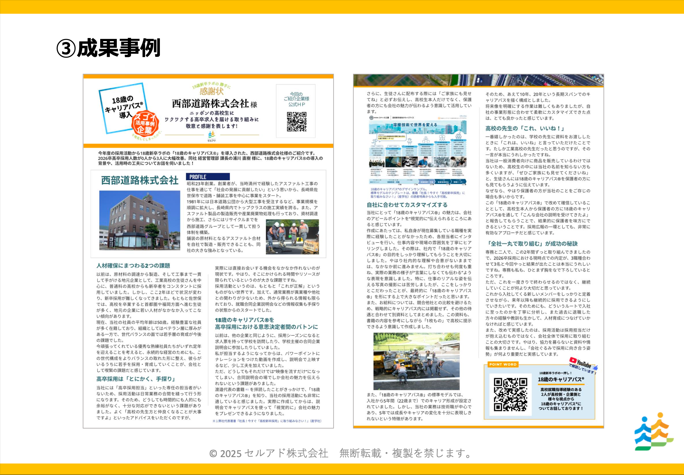 これまで個社ごとの作成支援を行ってまいりましたが、正しい作成手順と活用を行うことで、業種・職種や従業員規模、地域に関わらず、一定の成果を得ることができると確信し、これまでの作成支援の事例とノウハウをもとに、今後は、全国のより多くの高卒求人企業様に導入いただけるよう、提供方法や提供価格を見直し「18歳のキャリアパス®︎」作成・活用支援の輪を広げてまいります。