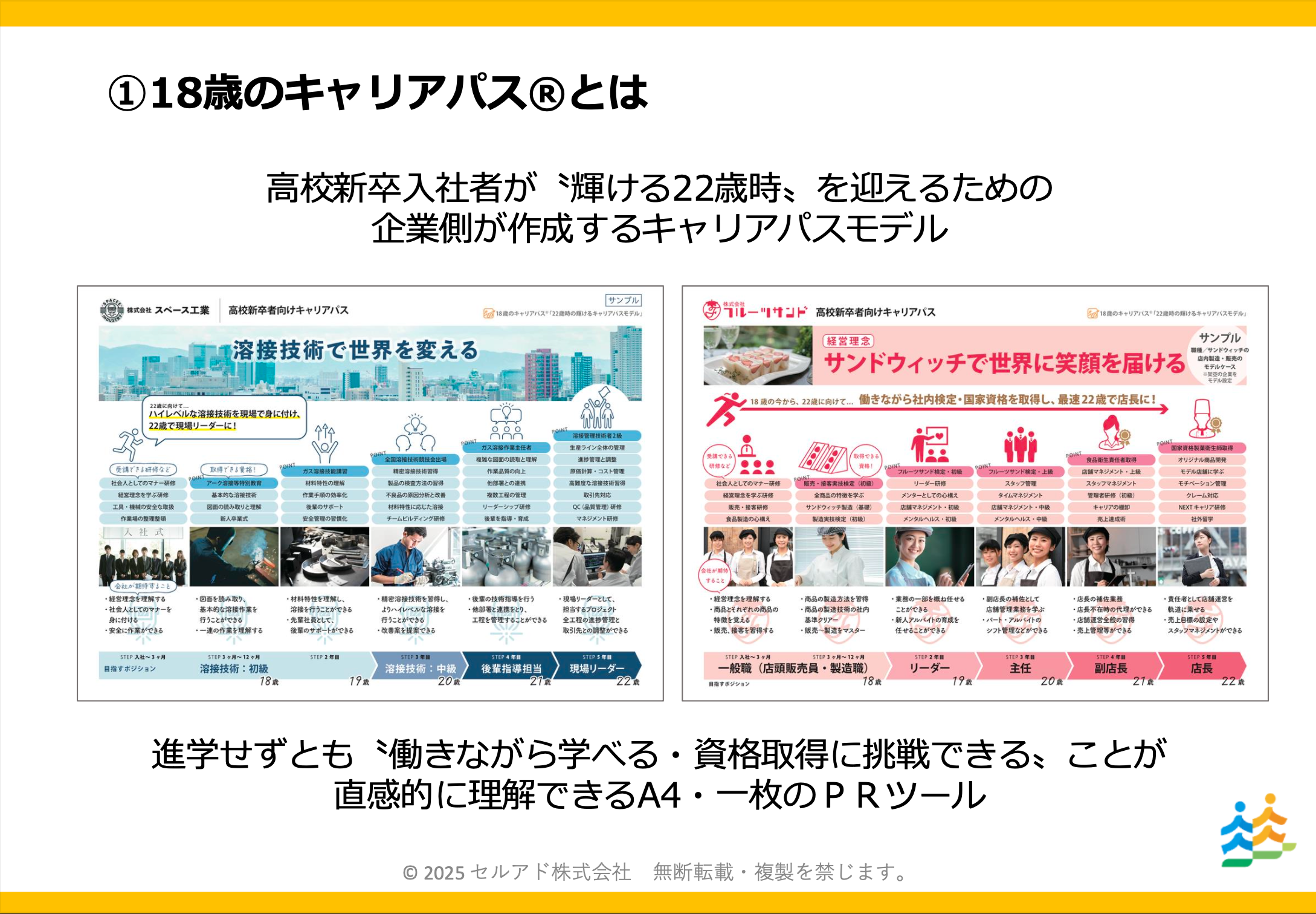 「18歳のキャリアパス®︎」は、高校新卒で入社した社員がいつどんなスキルを身につけ、どんな成長を遂げていくのか を、A4・1枚で示す“未来の設計図”。