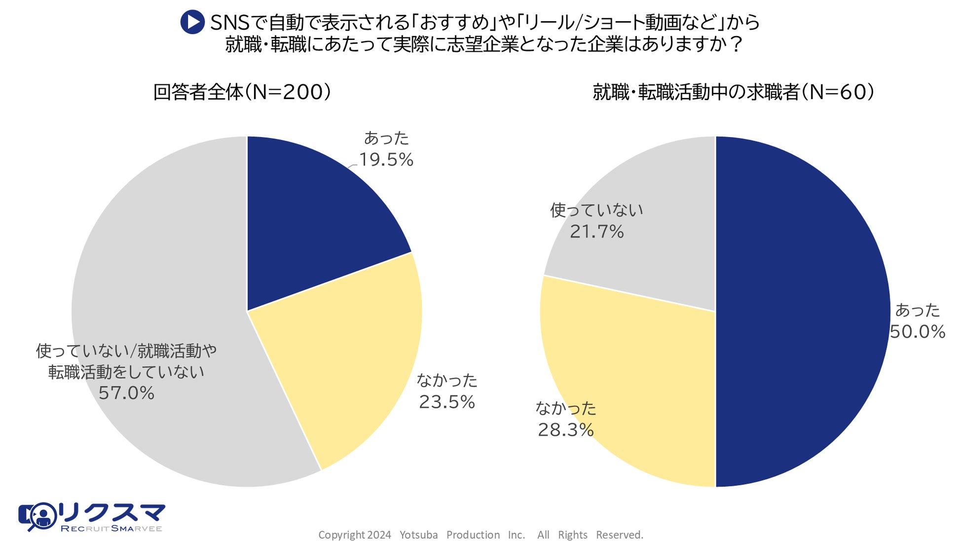 SNSで自動表示される「おすすめ」や「リール/ショート動画など」から就職・転職にあたって実際に志望企業となった企業はありますか?」という質問では、就職活動・転職活動中のステータスにある場合、50%のユーザーがショート動画等での「おすすめ」から志望企業になった企業があると回答しています。