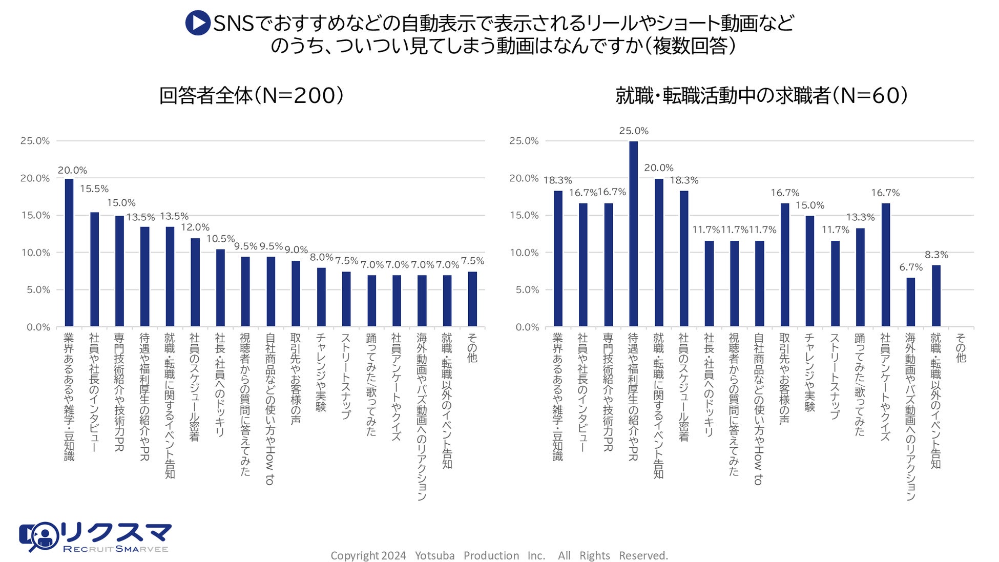 一方で就職活動中・転職活動中に絞った場合には、「待遇や福利厚生の紹介やPR」が大きく数値を伸ばしています(+11.5%)。また、「社員のスケジュール密着(+6.3%)」や「社員アンケートやクイズ(+9.7%)などが数値を伸ばしており、就職活動・転職活動段階の利用者には社風や人間関係がわかる動画として、社員が出演しているコンテンツは視聴がされやすい傾向が見て取れます。