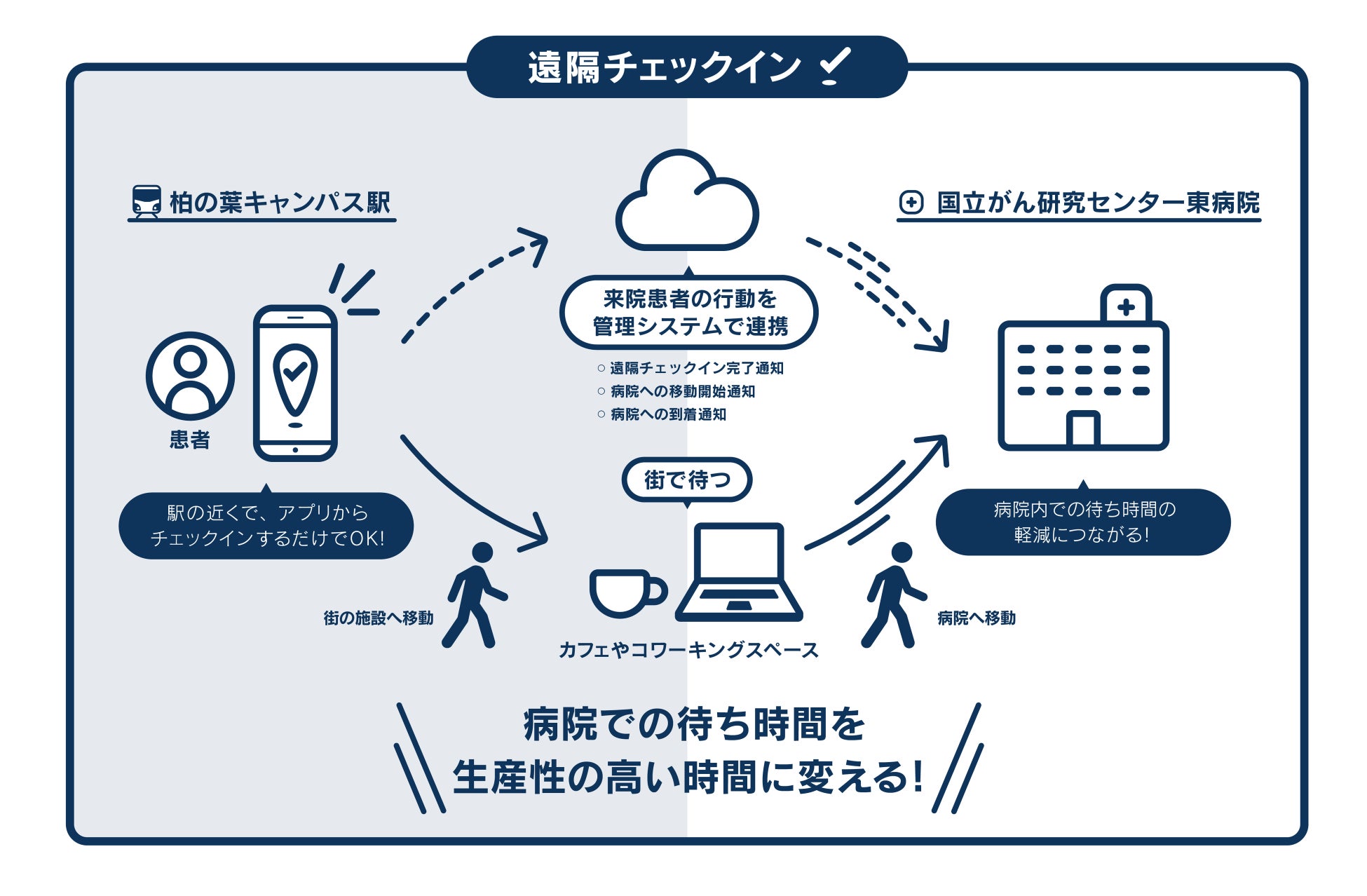 事前に診察予約を行った患者が、診察当日に病院の最寄り駅である柏の葉キャンパス駅に到着すると、アプリ内では位置を認識し、遠隔チェックインするためのボタンが起動します。患者側でボタンを押しチェックインに成功すると「待ち場所を選択する」画面が表示され来院時刻までの時間を街の施設で快適に過ごすことができます。患者の行動はリアルタイムに病院側の管理画面に通知がされ、再来受付処理が行われるため、患者は予約時刻になると直接診察室に向かうことができるようになります。