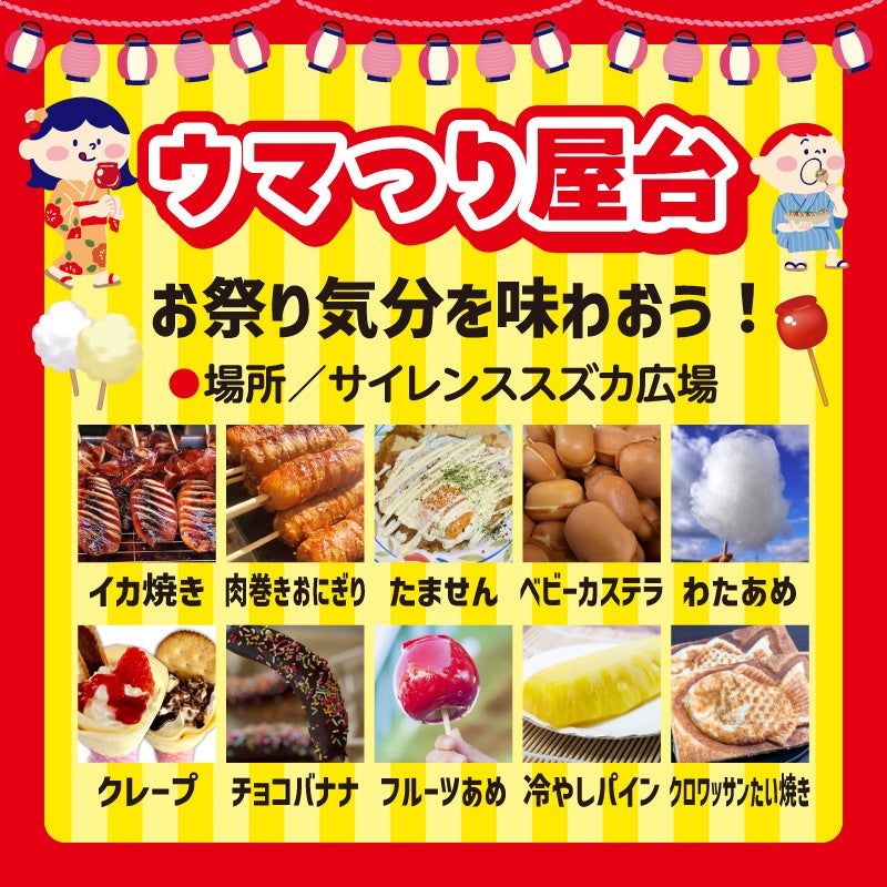 お祭り気分が味わえる屋台が登場!イカ焼き、肉巻きおにぎり、たません、ベビーカステラ、わたあめ、クレープ、チョコバナナ、フルーツあめ、冷やしパイン、クロワッサンたい焼きの10種類!