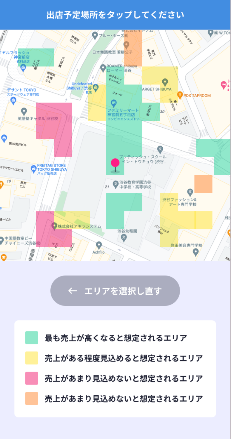 ・緯度、経度を地図上で選択し、指定の項目をご入力頂くことで、AIが技術売上の予測を行います。