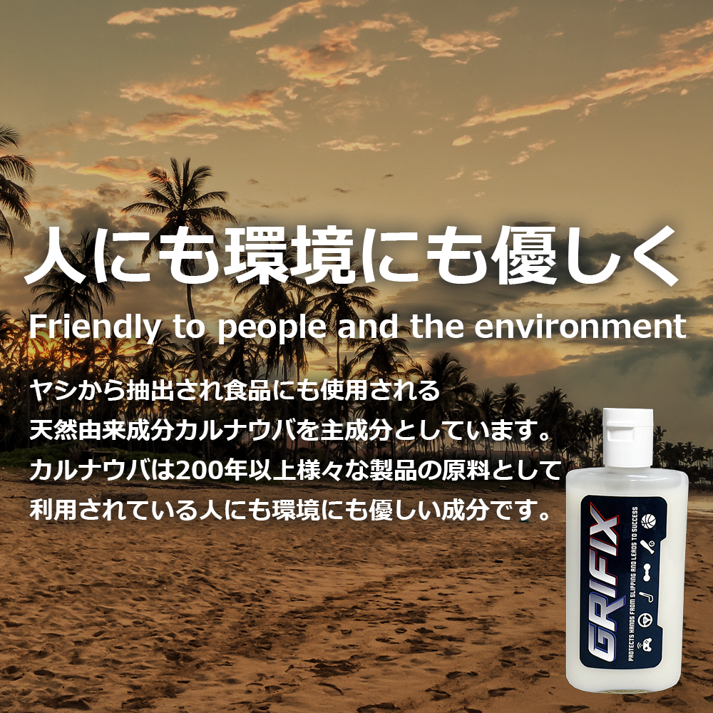グリフィクスは手のひらや指に塗布することで滑りを防ぐための高性能な液体グリップローションです。従来の液体グリップの原料は松ヤニやシリカ、ロジン、マグネシウム、アルミナ等ですが、グリフィックスは食品にも使用される天然由来成分カルナウバを採用しております。ヤシの葉から抽出されるカルナウバを主原料とすることにより、粉の発生を抑え成分付着で手も白くならないため、使用器具への粉移りや粉の入り込みなどの心配がありません。また、ご利用後は石鹸で手を洗うだけで簡単に取り除くことができます。