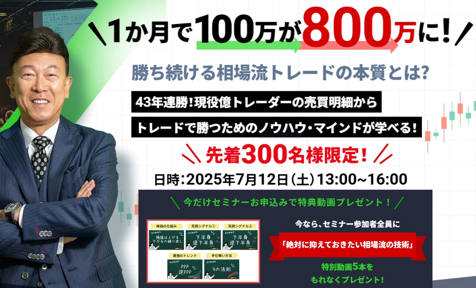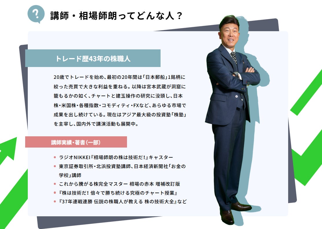 そこで今回、ラジオNIKKEIや東京証券取引所などでも講師を務める伝説の株職人・相場師朗氏が、自身の資産を8倍に増やしたトレード実績を基に、その技術と思考のすべてを公開する前代未聞のセミナーを企画いたしました。