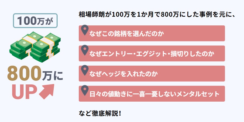 本セミナーでは、相場師朗氏が実際に100万円を1か月で800万円に増やした際の具体的な売買事例を教材に、銘柄選定からエントリー、手仕舞いに至る全プロセスを徹底解説。