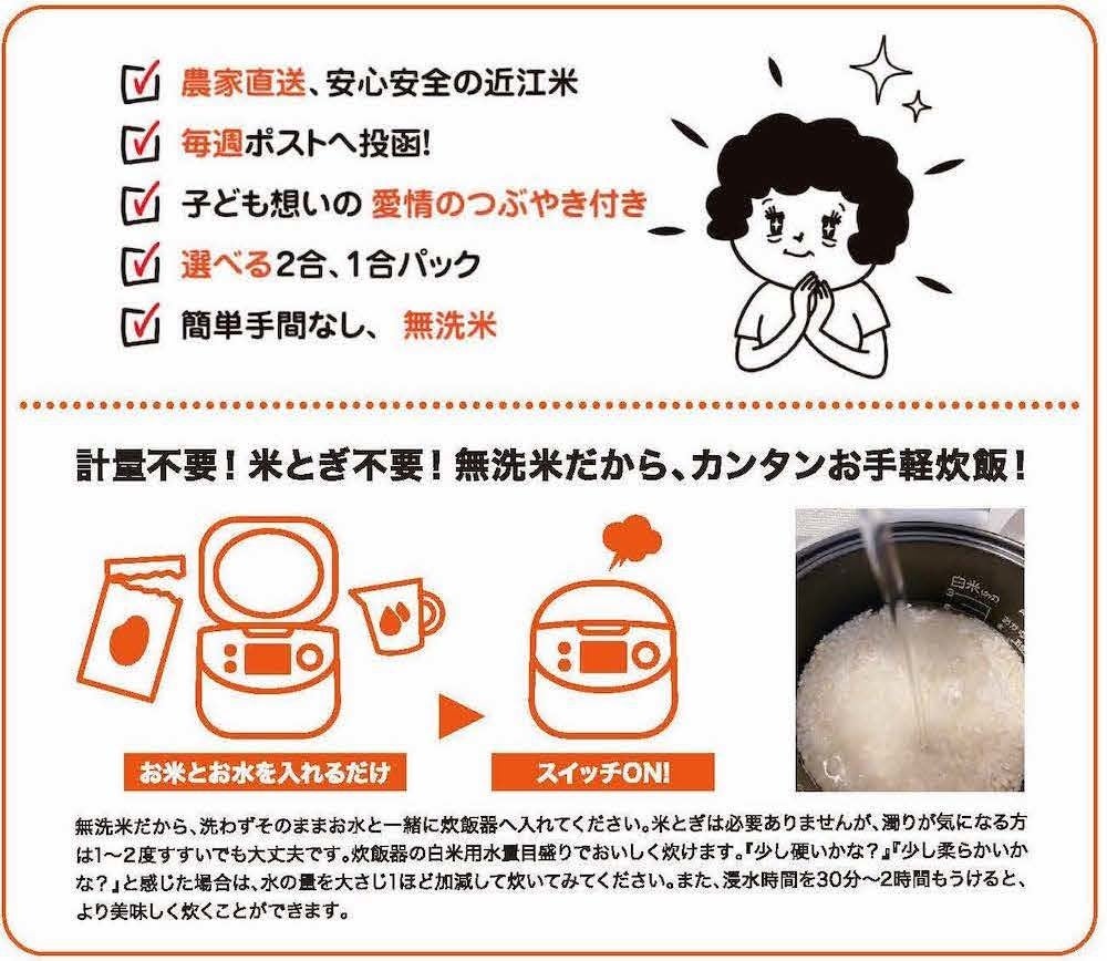 農家直送! 安心安全の近江米『こしひかり』の無洗米。食べきりサイズの選べる2合、1合パック。