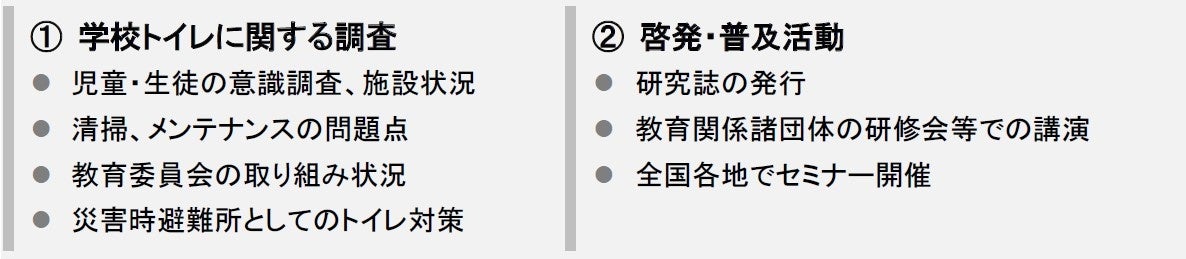 子どもたちや地域の人たちが安心して使える、清潔で快適な学校トイレづくりの実現を目指して、1996年11月に発足、トイレ関連6社により下記の活動を行っています。