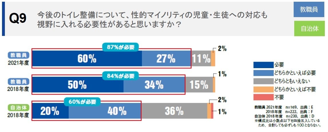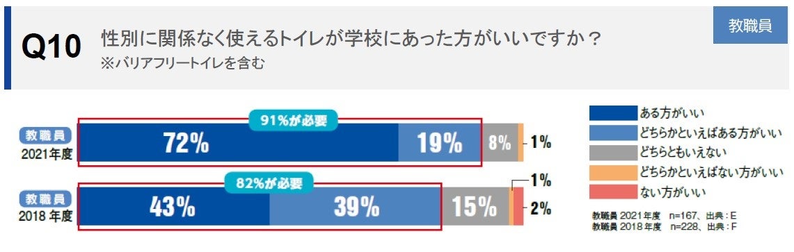 学校トイレ整備における性的マイノリティ配慮の必要性に対する教職員の認識は、「必要」「どちらかといえば必要」の合計が87%という結果になりました。※〔Q9〕 また、性別に関係なく使えるトイレがある方がいいとの回答は9割以上を占めました。※〔Q10〕