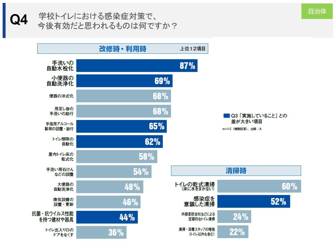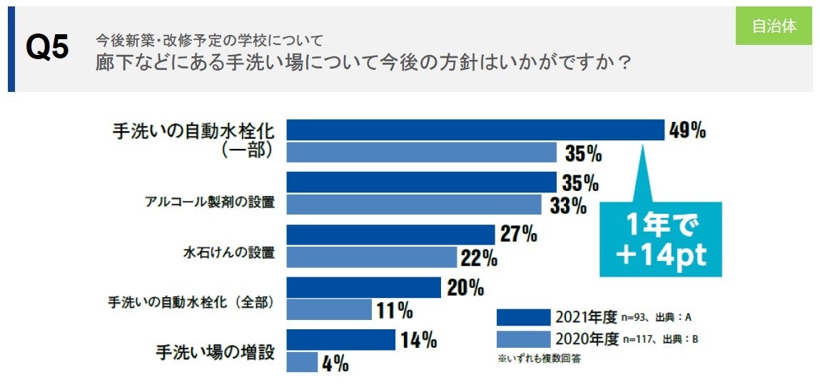 感染症対策として今後有効と思われるものについて「手洗いの自動水栓化」は87%と最も高く、感染症対策の中でも特に非接触化の強い意向が反映された結果となっています。※〔Q4〕 また、廊下などにある手洗い場の今後の方針について、「手洗いの自動水栓化(一部)」が49%と最も多く、1年で14ポイント上昇、「手洗いの自動水栓化(全部)」は2倍近くに上昇しています。非接触化をはじめ、水石けんやアルコール製剤の設置が今後の方針として考えられているようです。※〔Q5〕