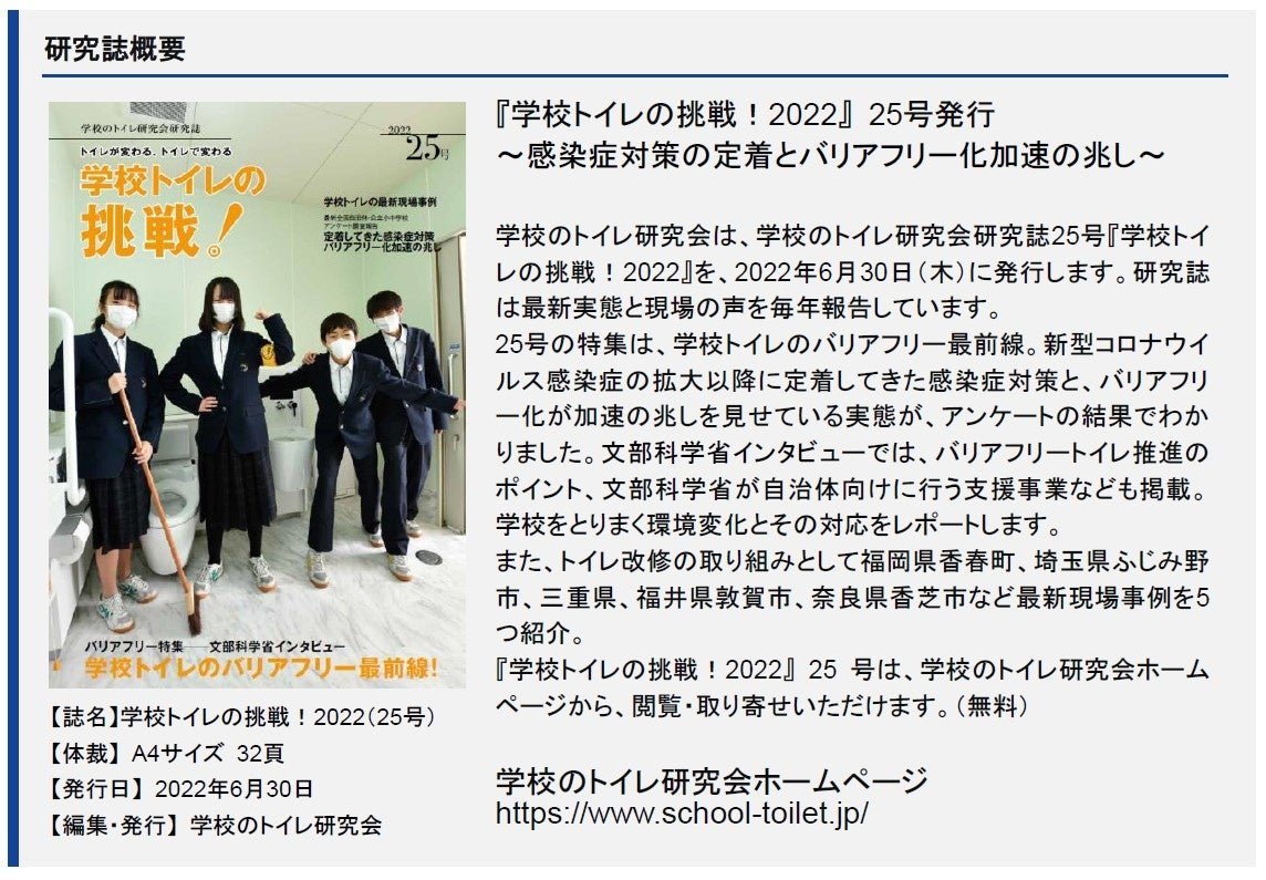 定着してきた感染症対策とバリアフリー化加速の兆し ~学校のトイレ研究会研究誌25号「学校トイレの挑戦!2022」発行~