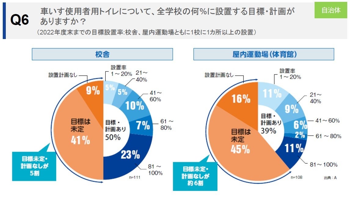 そこで、自治体に車いす使用者用トイレの2022年度末までの設置目標・計画を聞いたところ、「校舎への設置」では目標・計画があるとする自治体が50%、目標未定・計画なしが50%と、二分する結果となりました。また、設置目標・計画がある自治体の内、所管の学校の81%以上に設置するとした回答がトップとなりました。しかし、Q2の回答からもわかるように、バリアフリーが重要という認識はあっても、車いす使用者用トイレの計画が決まっていない自治体がまだ多いということです。特に屋内運動場は、目標・計画があるとする自治体が39%にとどまっています。※〔Q6〕