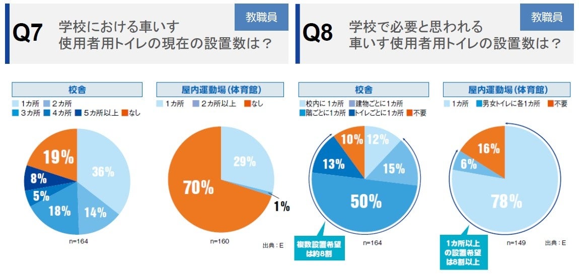Q7・8では、学校教職員に対し、車いす使用者用トイレの設置状況を聞いています。実際の設置数では、校舎では約2割が設置されておらず、屋内運動場では7割が設置されていないということです。