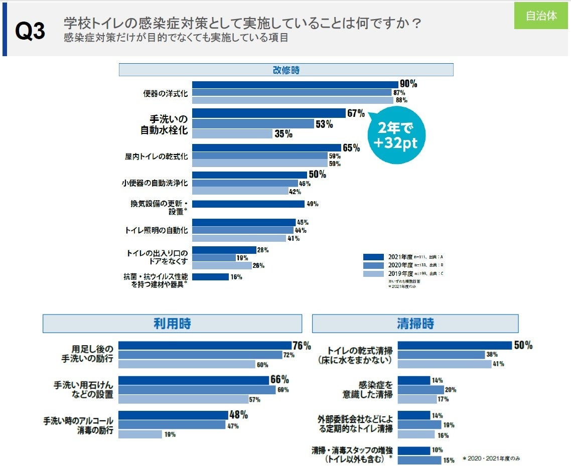 「2021年度全国自治体アンケート」の調査結果では、学校トイレの感染症対策として実施している事について、改修時における「手洗いの自動水栓化」は67%で、2年で32ポイントという顕著な伸びを示し、「小便器の自動洗浄化」「トイレ照明の自動化」といった非接触=タッチレスに関する項目が年々増加傾向にあります。※〔Q3〕