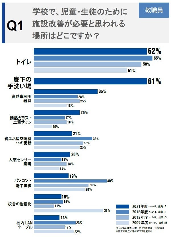 学校のトイレ研究会が実施した「2021年度全国公立小中学校教職員アンケート調査」の結果では、学校で、児童・生徒のために施設改善が必要と思われる場所は「トイレ」が62%と最も多く、続いて「廊下の手洗い場」が61%となりました。※〔Q1〕 特にトイレは、2009年度以降、4回の調査結果すべてにおいて唯一、過半数を占め、最上位となっています。廊下の手洗い場は2021年度調査で新しく加わった項目ですが、これも他を大きく上回る数字となりました。