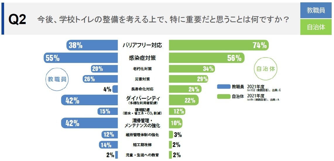 「2021年度全国自治体アンケート」の調査結果では、今後、学校トイレの整備を考える上で特に重要だと思うことについて「バリアフリー対応」が74%で1位となり、バリアフリー化が加速する兆しが見られました。※〔Q2〕
