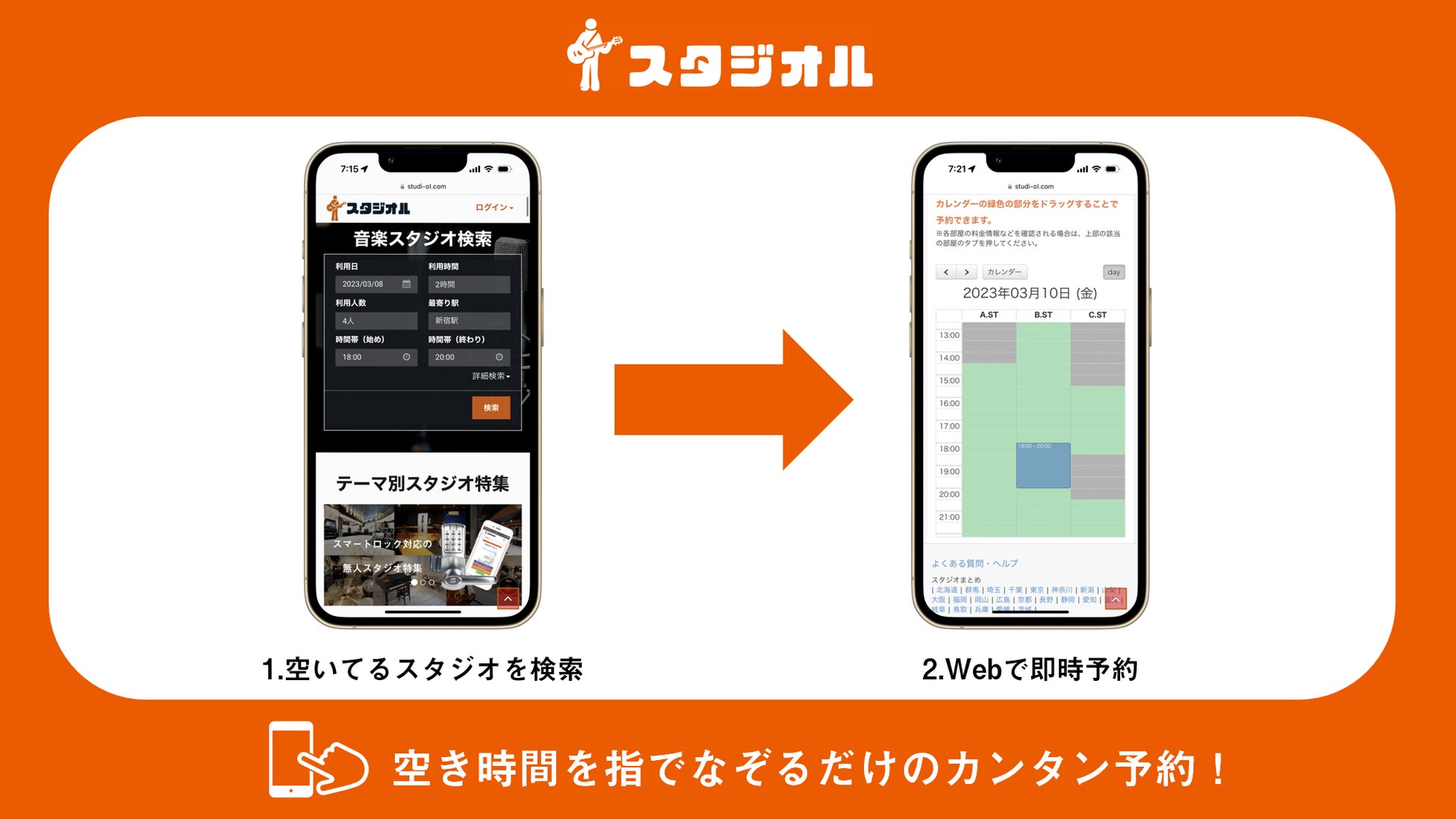 「スタジオル」は2017年10月にリリースされ、従来は電話・店頭予約が主流だった音楽練習施設のWeb予約がカンタンにできることをコンセプトとしており、2023年4月10日現在会員数が107,452人、累計Web予約件数890,711件の国内最大級の音楽スタジオ予約サイトとなっております。