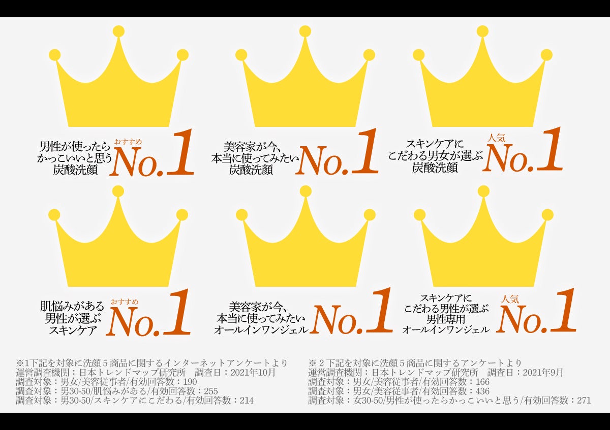現在展開中のスパークリングフェイスウォッシュ(炭酸洗顔)、オールインワンジェルは誕生から1年経たず、モニターアンケート調査の結果、「美容家が今、本当に使ってみたいオールインワンジェルNo.1」「スキンケアにこだわる男女が選ぶ炭酸洗顔人気No.1」などの6冠を受賞しています。