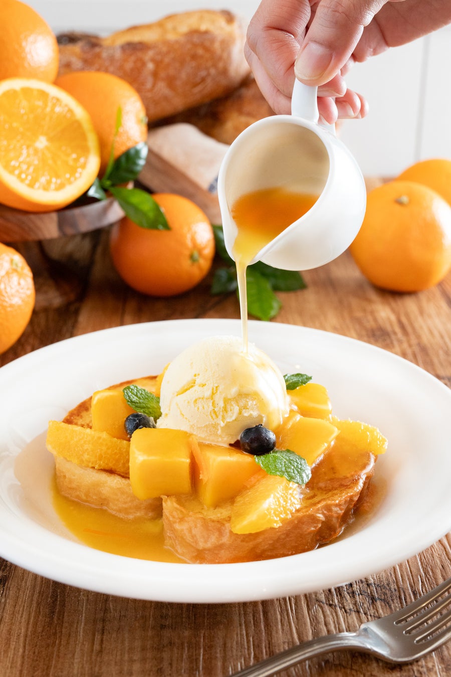 オレンジリキュールが香るソースで煮込み、シュゼット仕立てにしたフレンチトーストです。溶けだしたバニラアイスと絡めるとより一層美味しくお召し上がりいただけます。