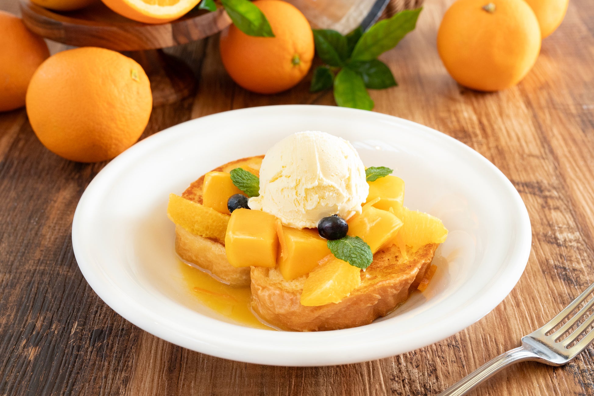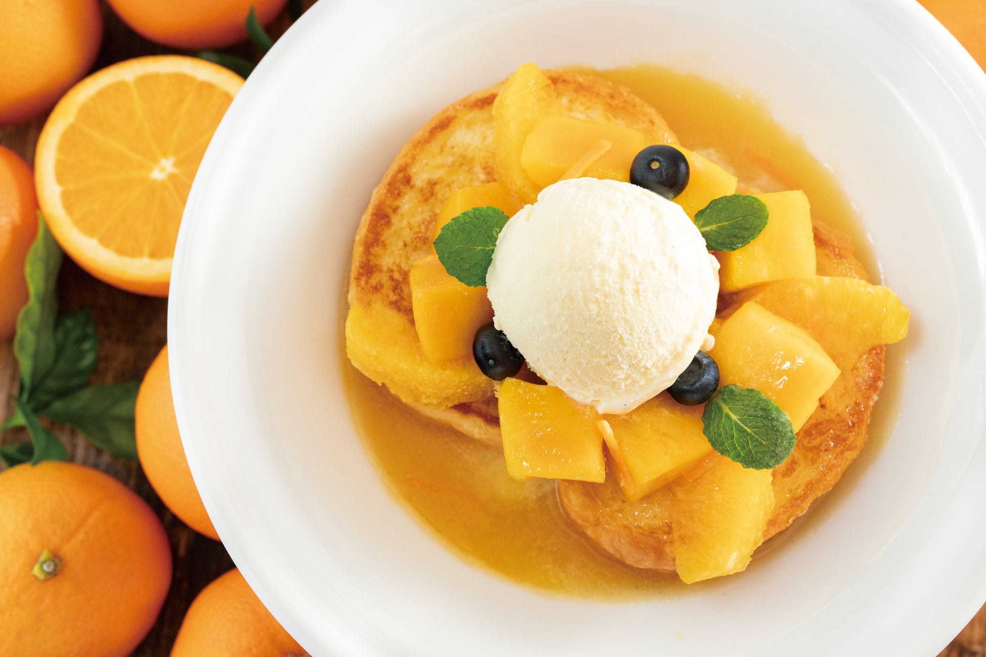 当メニューは、フランスの伝統デザート『クレープシュゼット』の味わいをフレンチトーストで再現したいという思いから生まれました。柑橘の酸味と香りをよりお楽しみいただくため、オレンジ・マンゴー・ブルーベリーをたっぷりとトッピングしました。